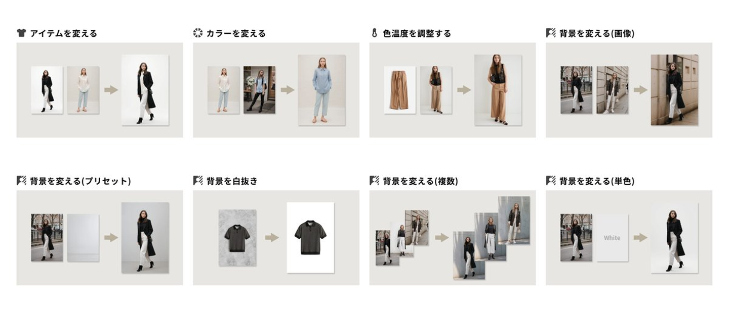 アパレルECの現場作業に特化した生成AIツール. AI技術によって、撮影画像の編集を誰でも簡単に行えるWebアプリ。背景やアイテム人物を想いのままにすげ替えられます。
