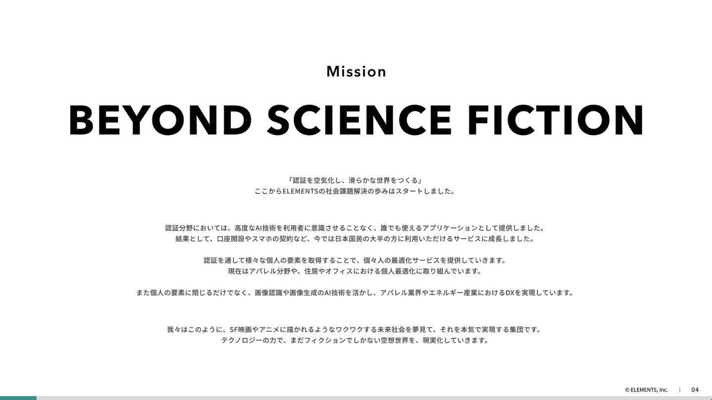 画像解析・生体認証の可能性に魅了された4人のメンバーからスタートしたELEMENTSは10年を節目に、挑戦を続けます。 SF映画や アニメに描かれるようなワクワクする未来社会を夢見て本気で実現していく稀な集団として、テクノロジーの力でまだフィクションでしかない空想世界を現実化していきます。