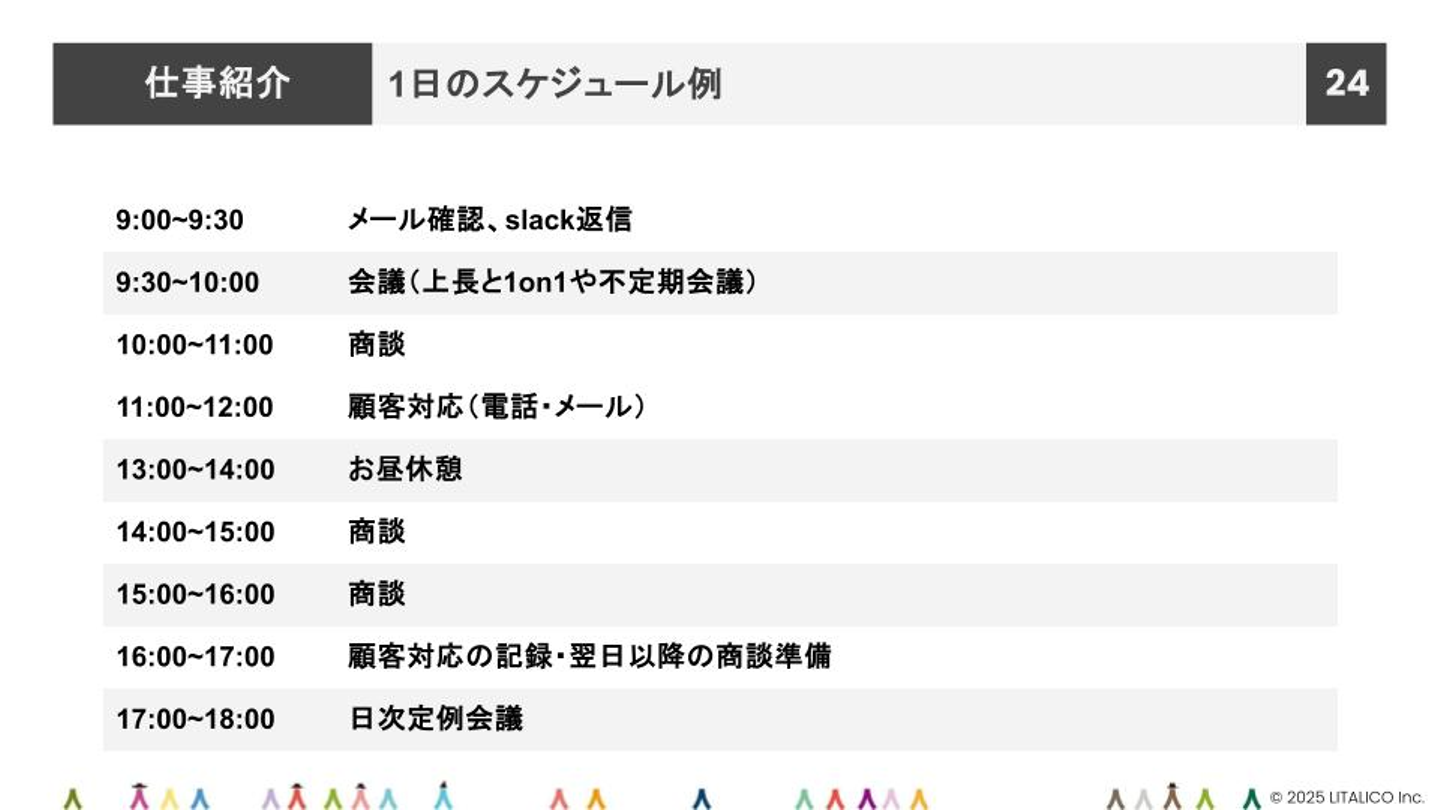 現在はアシスタントマネージャーとしてチームを率いつつ、プレイヤーとしても最前線に立っています。始業後はメールやSlackのチェックからスタートし、午前中は上長と会議で認識を合わせ、10時から商談へ向かいます。