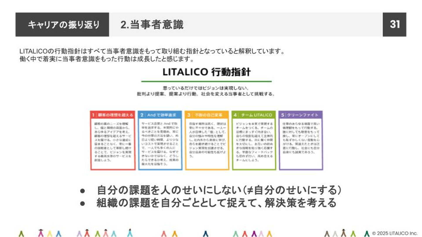 「入社したての頃は、私も『マニュアルがわかりにくいから失敗した』とか『上司の指示が曖昧だったからできなかった』など、環境のせいにしたくなることがありました。でも、LITALICOで言う『当事者意識』とは、自分を責めることでも、全てを一人で抱え込むことでもありません。『組織の課題を自分ごととして捉え、解決に向けて動くこと』なんです」