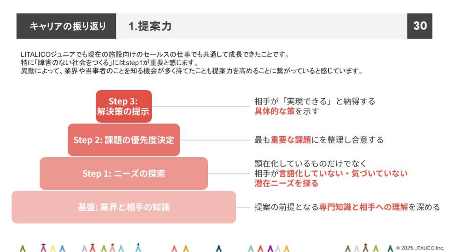 「お客さまが言葉にしている『顕在的な悩み』だけでなく、その裏にある『潜在的な課題』まで深掘りすることが重要です。例えば『集客に困っている』という相談でも、詳しく聞けば『支援の質に自信がなく、アピールできていない』ことが本質的な原因かもしれません。これらの潜在的な課題を見出し、重要な課題と先方と合意します。そして、そのための解決策を提案していく。解決策の提案には、LITALICOには多様な事業があり、膨大な支援ノウハウがあることが生きてきます。それらを組み合わせることで、お客さまの期待を超える解決策を提示できるようになった時、自身の成長を感じました」