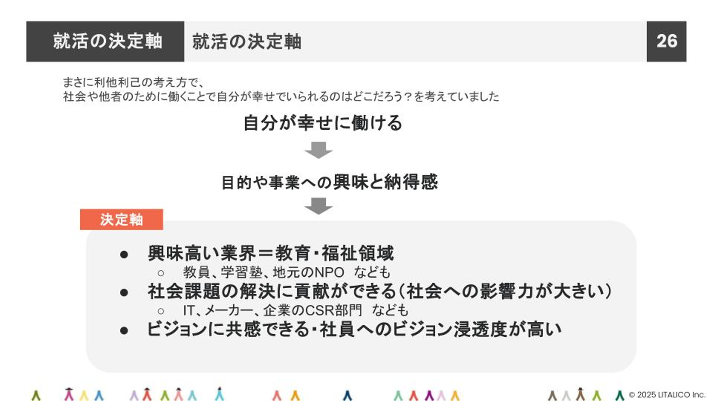 1つ目は、教育・福祉という自分が興味のある分野であること。 2つ目は、社会課題の解決に貢献ができ、社会に対して高い影響力を持っていること。 3つ目は、社員一人ひとりにビジョンが浸透しており、全員が同じ方向を向いていることです。