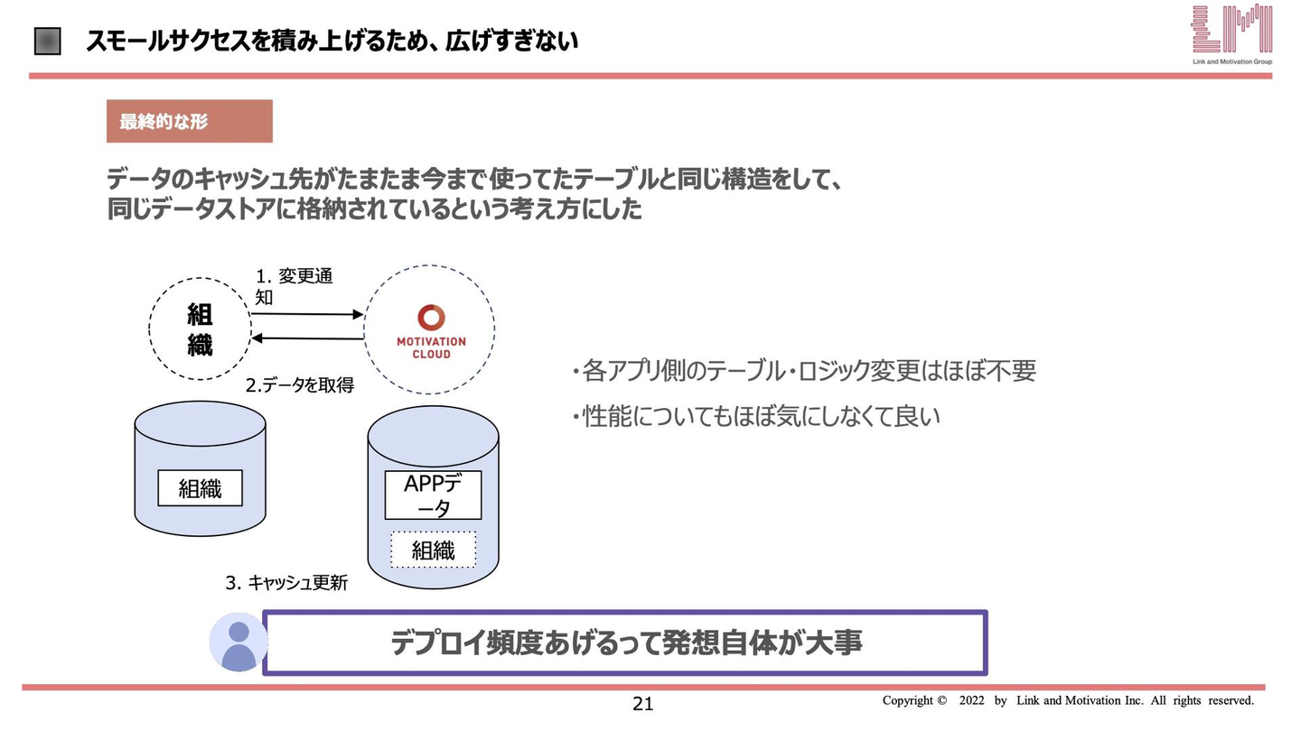 今回のチャレンジでは、最終的に「データのキャッシュ先がたまたま今まで使っていたテーブルと同じ構造だった。そして同じデータストアだった」という考え方をしました。具体的には組織基盤から変更通知してデータを取得し、モチベーションクラウド側の組織情報を更新しています。そうすることで、実際にテーブル構造は変わっていないので、各アプリのテーブル・ロジック変更はほぼ不要になります。性能についてもほぼ気にすることなく分離をすることができました。