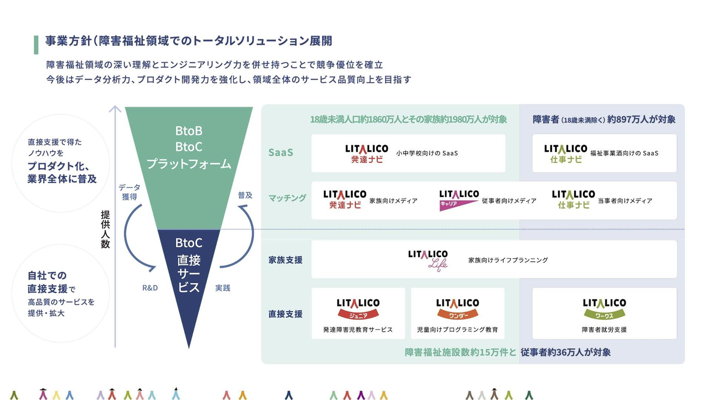 そもそも当事者の方を取り巻く社会環境には様々な場面があり、その至るところに課題が存在しています。互いに関連しあう課題もあるため、一つの課題を解決するプロダクトだけを作って大きく育てても本質的な課題解決には繋がりません。そのため多くのSaaSやWebサービスを作り、あらゆる課題に対して多様なソリューションを展開していく必要があります。そして、それらがバラバラに存在しても意味がないため、包括的なLITALICOのサービスとして提供し、そこから得られる膨大なデータを活用して業界を変革していきたいと考えています。