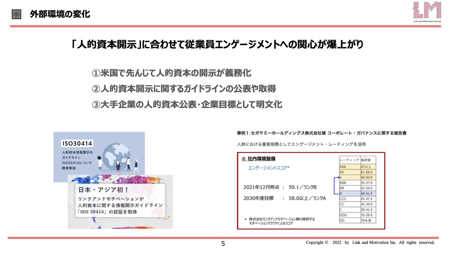 最近では企業経営者や投資家の間で、従業員エンゲージメントをはじめとする「人的資本開示」に対する関心が高まっています。米国では2020年に人的資本の開示が義務化された他、日本でも人的資本開示に関するガイドラインが公開され、大手企業においては、人的資本開示を経営目標にする動きも出てきました。このような外部環境の変化から、従業員エンゲージメントについて最近特に注目が集まってきているように感じます。