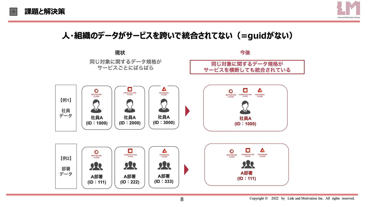 そのようなトレンドを受けて、LMではエンゲージメントチェーン構想という戦略を打ち出しています。エンゲージメントチェーン構想とは、エンゲージメントに関わる組織や個人のデータを、LMが保持しているデータと統合することで新しい価値を提供する試みです。社内外のデータをやり取りしながら、大きな一つのデータベースを作りたいと考えています。そのため、プロダクトを跨いだデータ統合や、他サービスとの連携が重要になってきています。