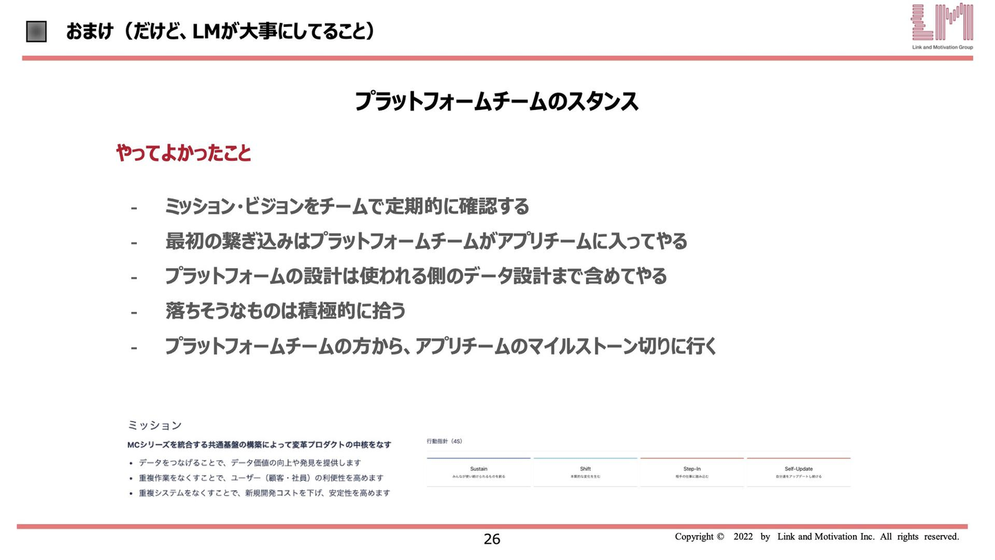 共通基盤のプロダクト開発を進めるにあたって、大事にしていることがあります。それはプラットフォームチームのスタンスです。LMが大事にしている組織作りにも通じるのですが、やってよかったことがいくつかあるので、こちらはパネルディスカッションでも詳しく紹介します。