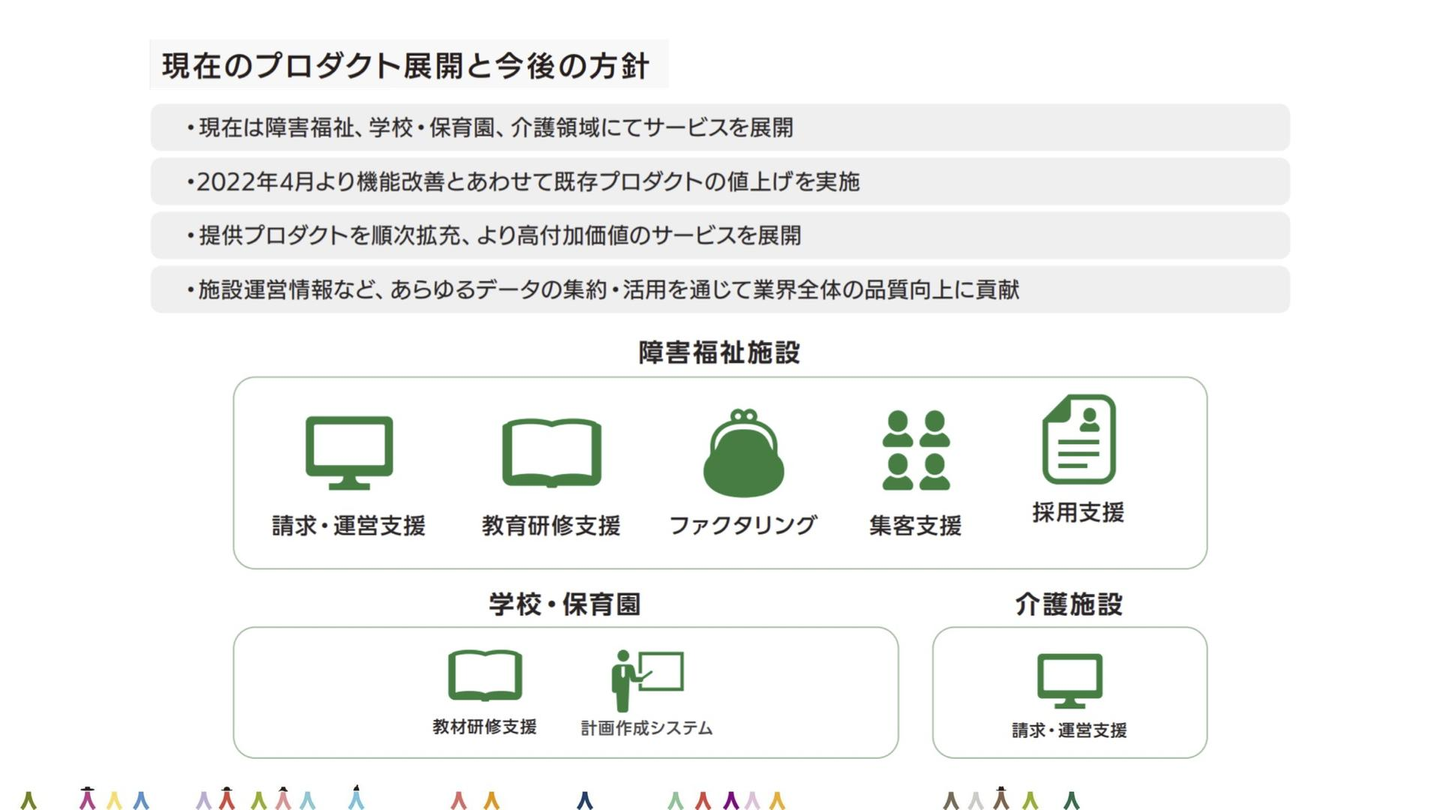 特徴的なのは、WebサービスやSaaSなどIT事業だけをやっている会社ではなく、自社で全国約260箇所に事業所を展開して、直接支援サービスも提供している点です。直接支援サービスを通じて得られるノウハウを、WebサービスやSaaSプロダクトに価値転換し、より業界全体に普及させていく。そうすることで社外からも広く多様なデータが集まり、それをさらに活用して、サービスの品質向上や新規サービスの立ち上げにつなげ、実践を繰り返してまた普及させていく・・・、という連続したサイクルを経営の骨子としています。