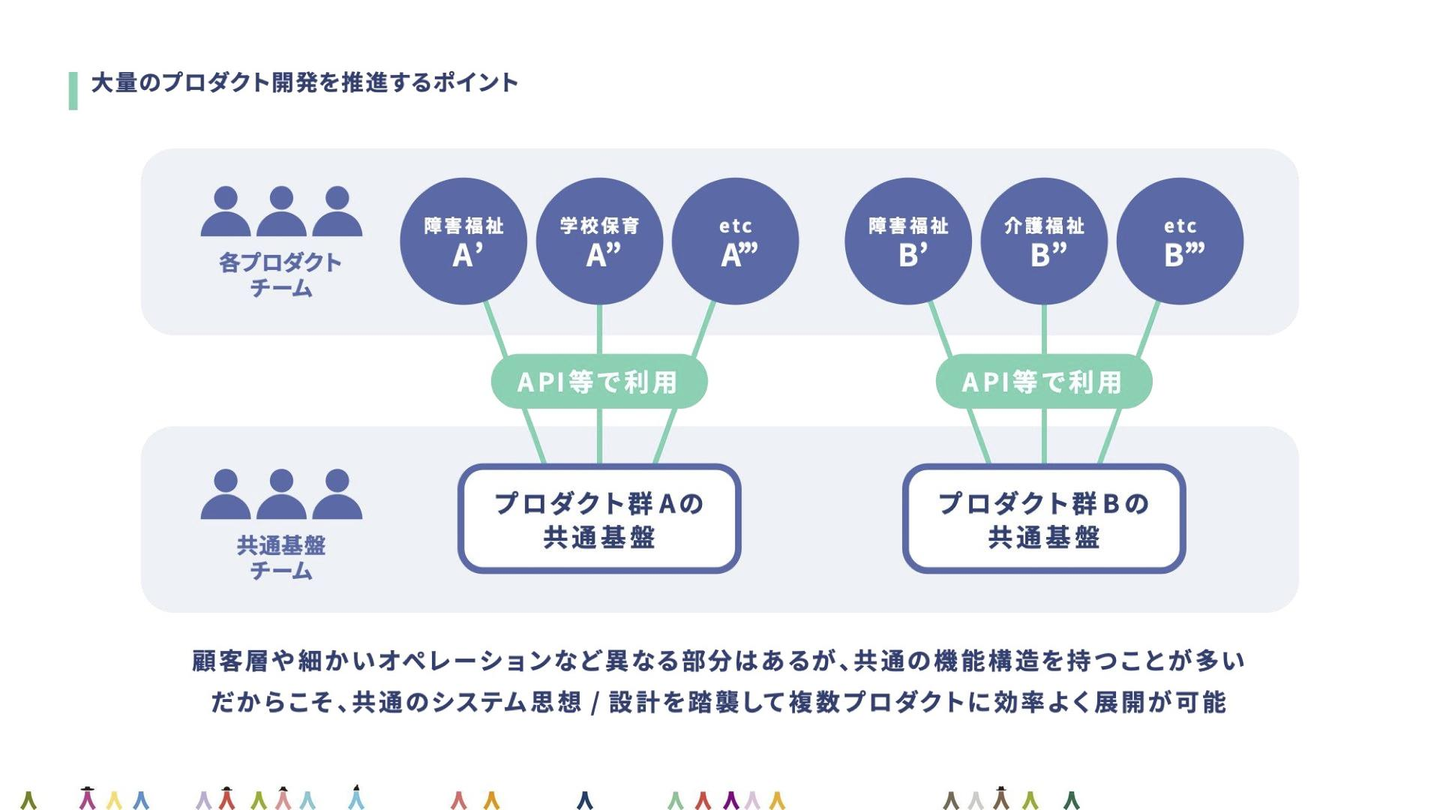 障害福祉の分野では3年に一度大きな法改正があり、機能も法令と密接に関わってきます。そういう対応もプロダクト毎に分散した状態ではなく、対象を局所化することでリターンを得られると判断して、共通基盤化に踏み出しました。