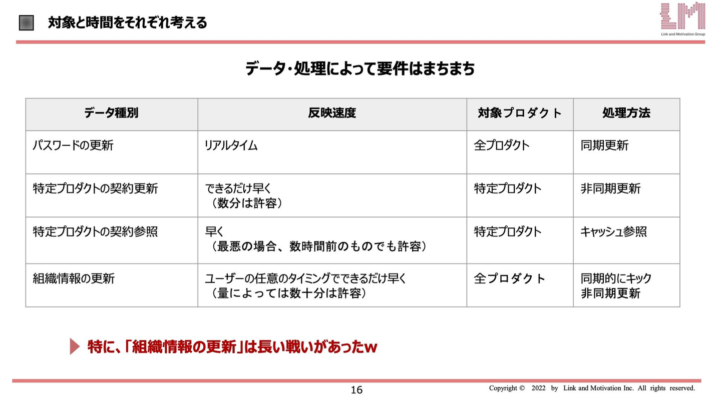一つ目は、どこまでリアルタイムにデータ反映するかです。これについては、対象と時間それぞれに分けて考えました。実際データと処理によって要件は様々なので、LMではマトリックスを組んで、各処理をどのような反映速度でやるのか、実際にどういう方法で同期するかを整理しました。例えば、パスワード更新はリアルタイムで行い、APIがエラーで落ちている場合は同期的にエラーメッセージを返却します。特定プロダクトの契約更新では、処理が複雑で内部でさらに他システムへのリクエストが必要なところもあるため、非同期更新を選択しています。契約情報の参照は、契約基盤が落ちてしまうことも考慮しなければなりません。その場合でも少なくとも使えるようにキャッシュをかませながら参照しています。