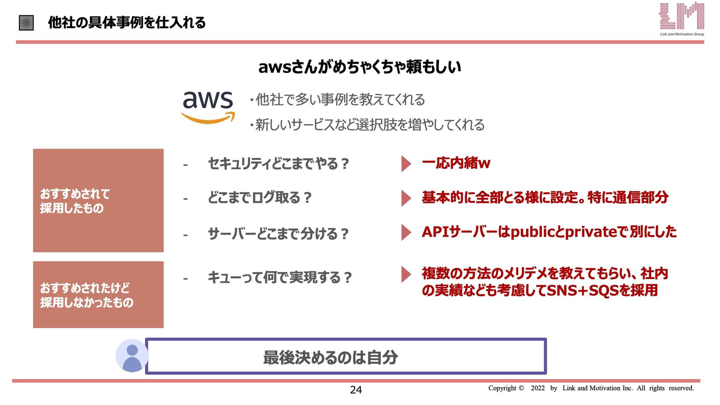 最後が、構成をどうするか、セキュリティをどこまでやるのかです。これは他社事例を積極的に仕入れました。社内でも論点がいくつかでてきたのですが、細かい課題に対する解決策については、外部から情報を得るのが大変でした。そのため、AWS社に相談しながら進めました。