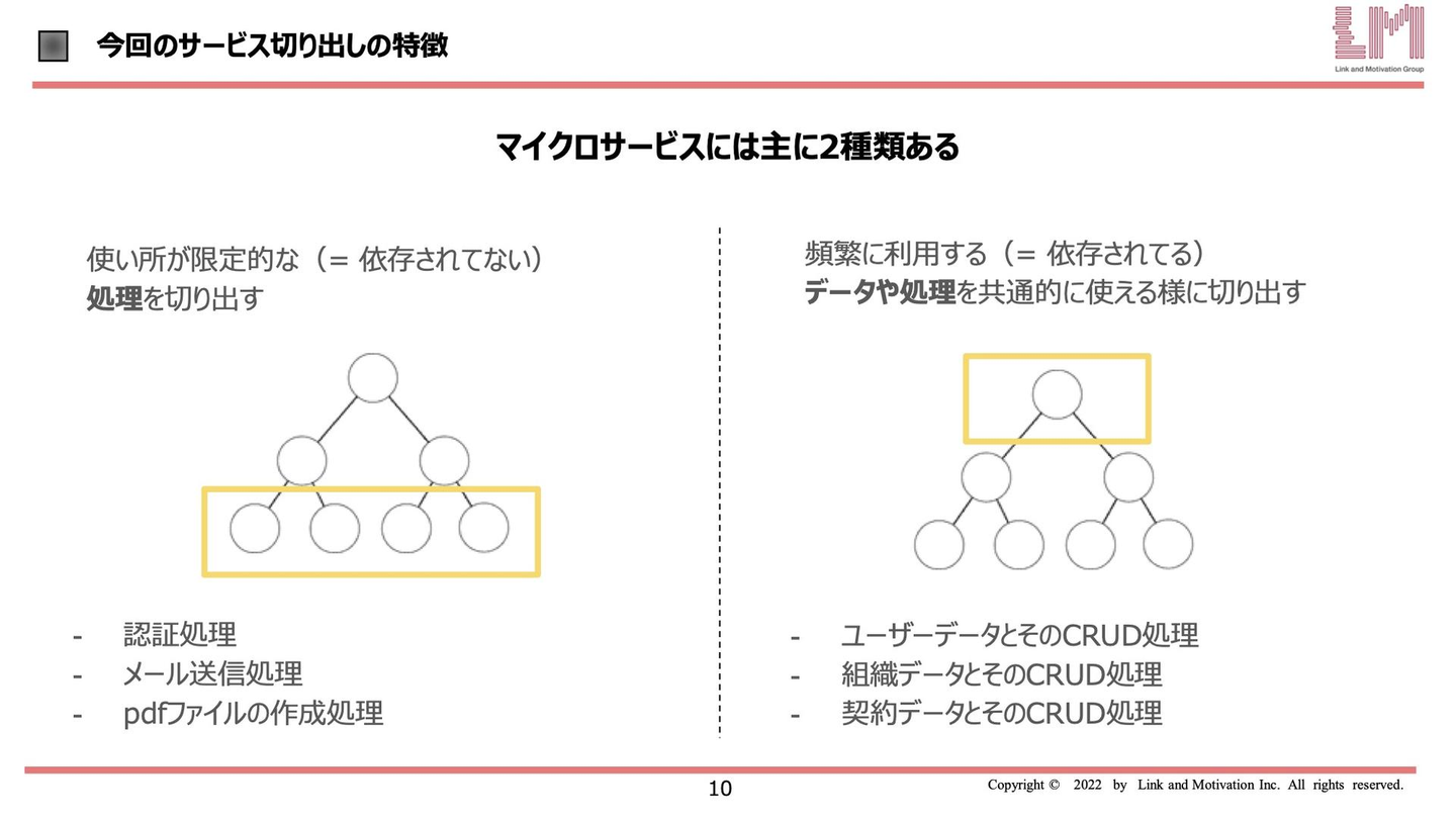 一般的にマイクロサービスには、依存されていない処理を切り出す場合と、頻繁に利用されるデータや処理を共通的に使えるように切り出す場合の、大きく2種類があります。図の左側の処理を切り出すところは、認証やメール、PDFファイルの作成などが該当しますが、ここはAuth0やSendGrid、AWSLambdaなどサードパーティを活用して実施済みです。