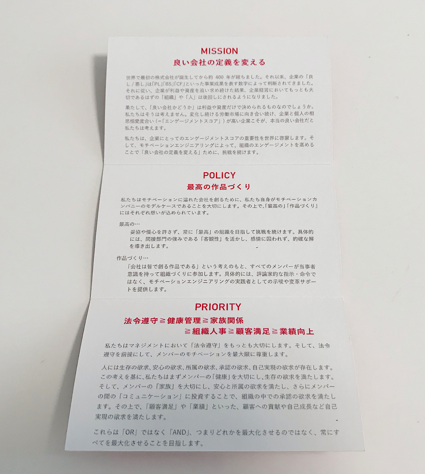 若手から経営陣まで社員の家庭環境の向上をサポートしてくれるのですが、それが浸透している理由は、リンクアンドモチベーションの行動指針であるリーダーシップスタイルが存在しているからだと思います。 リーダシップスタイルというのは働く上で 『法令順守≧健康管理≧家族関係≧組織人事≧顧客満足≧業績向上』を遵守しましょう、という行動指針 のことです。