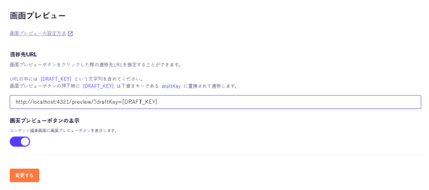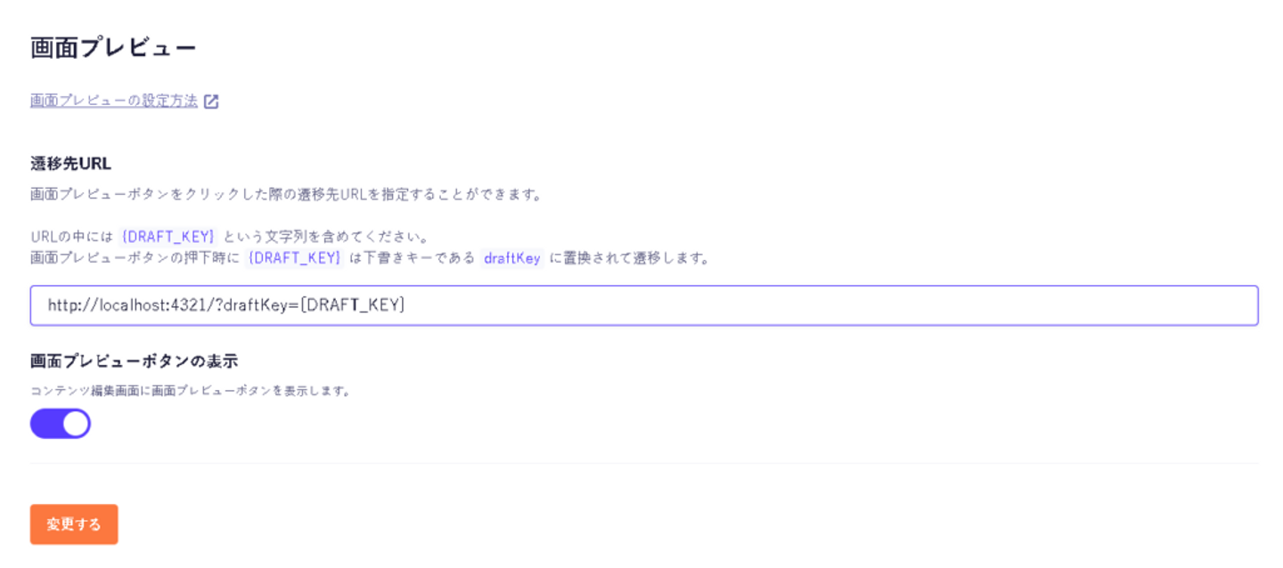 microCMSの管理画面から、画面プレビューボタン押下時の遷移先URLを指定することで、