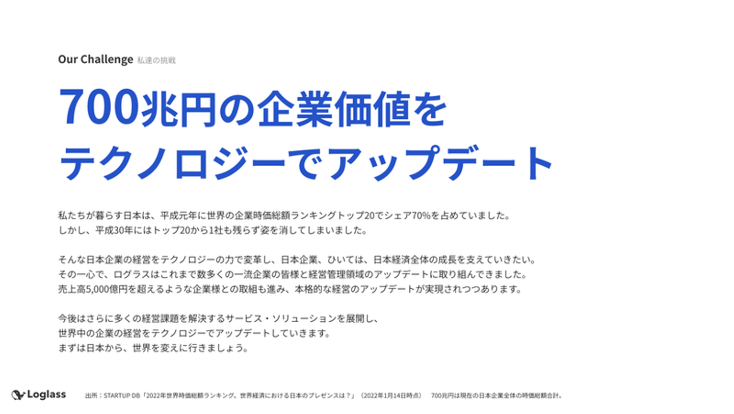 ログラスによって、日本企業の企業価値向上がより加速され、日本全体が良くなれば、それは海外からの投資が集まることに繋がる。ある意味、日本自体の国力上昇に貢献していけるという、大きな世界を目指しています。
