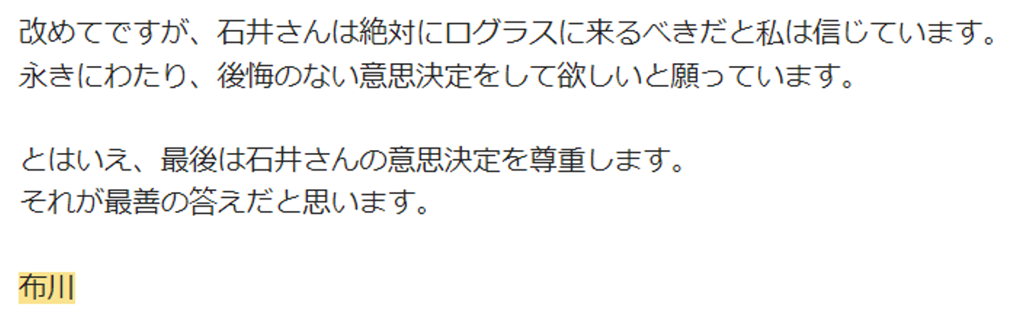 意思決定をするにあたり、各社の代表やマネージャーと話をする機会をいただいたのですが、ログラス代表の布川さんからもご連絡をいただき、直接お話しすることができました。その時に、私は決断できたと考えてます。