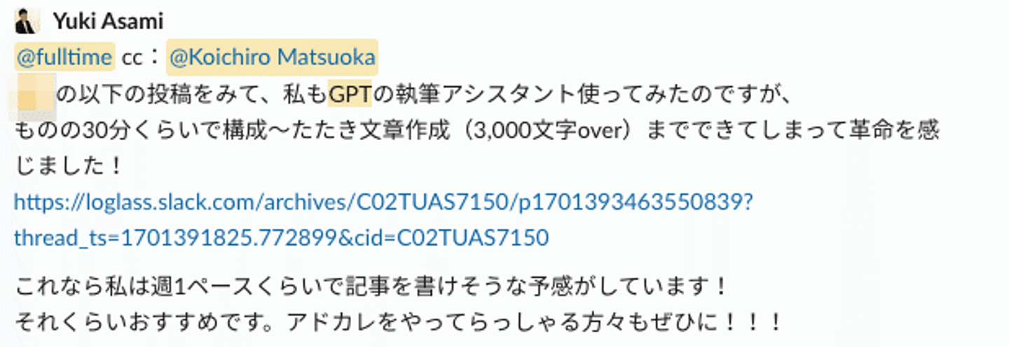社内のSlackで「GPT」というワードでウォッチし、「よかったら相談に乗りますよ!」とこちらから積極的に相談にのる機会を作りました。