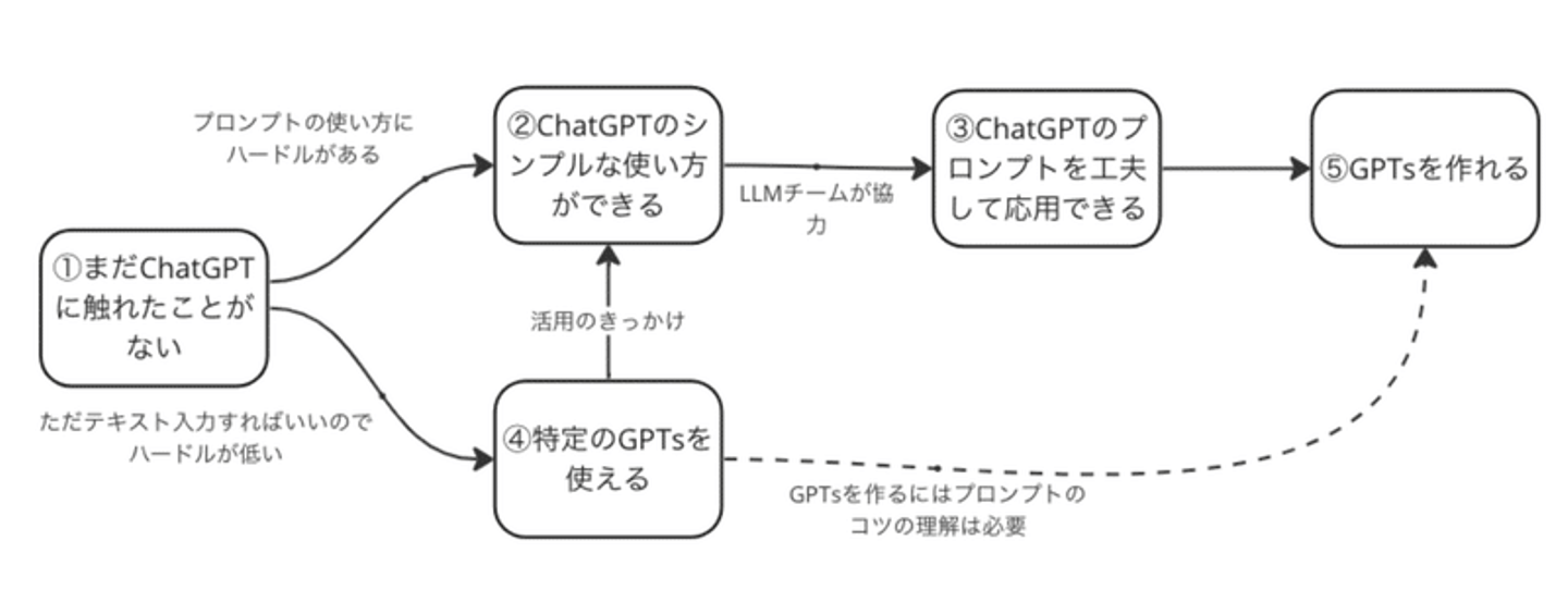 そして次のステップとして、GPTsを作って展開できる人を増やしていこうとしています。ChatGPTもGPTsも、LLMチームだけでは全社に与えられるインパクトが小さいので、やはり主体的に推進してもらえることが重要です。