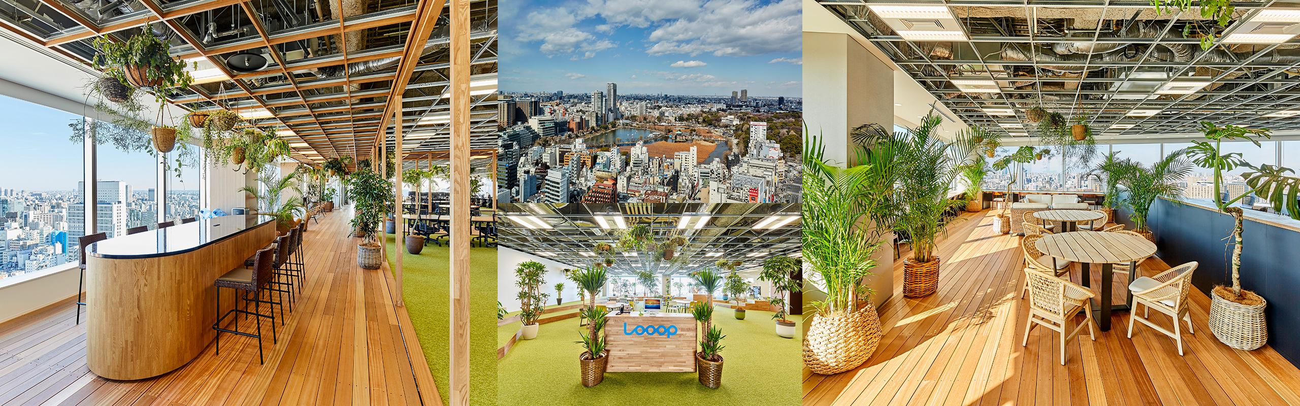 上野オフィスは執務エリア内に緑がたくさん!PCを見て疲れたときは、近くの観葉植物で癒されること間違いなしです。上野公園や不忍池が一望できる絶景オフィス、ぜひ遊びにきてくださいね。