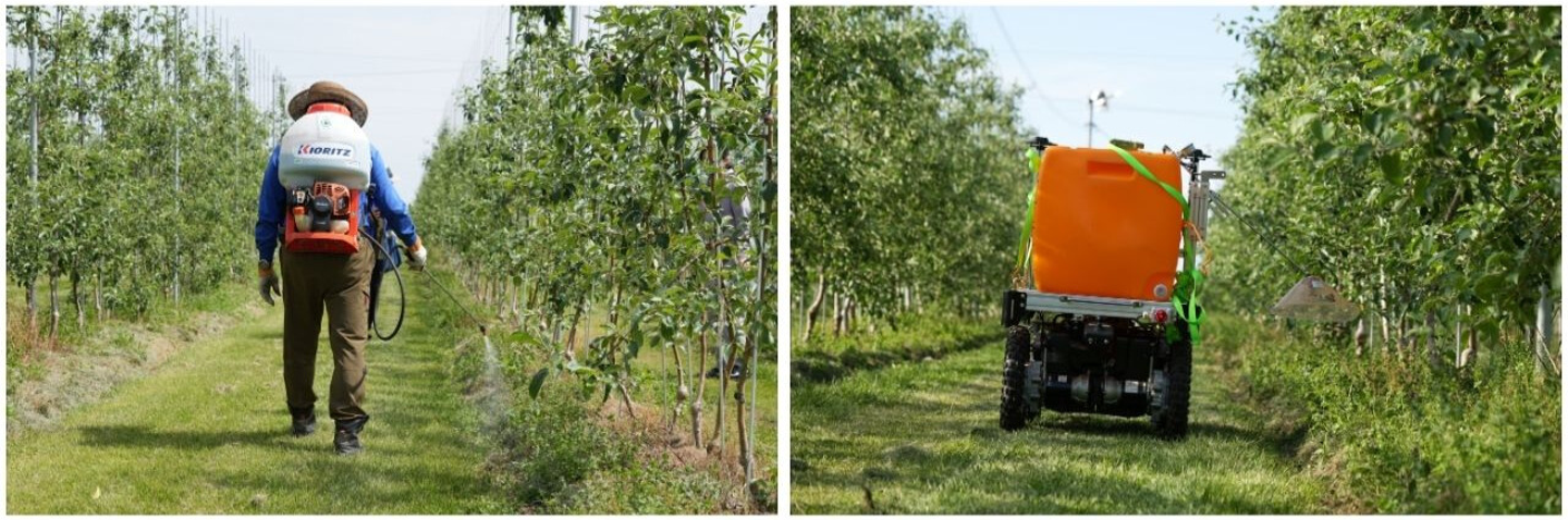 ◀農家さんは約15ℓの噴霧器を背負い、手散布で広い圃場を歩き回る。一定のスピードで、的確な場所に、適量をまく、その手際の良さには脱帽。 ▶Mobile Moverが自動走行で除草剤散布。
