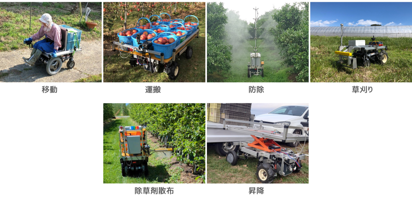 主に農業用途での活用に力を入れ、移動、運搬だけではなく、除草剤散布、防除、草刈り、昇降機能など、ワークのラインナップを増やしています。