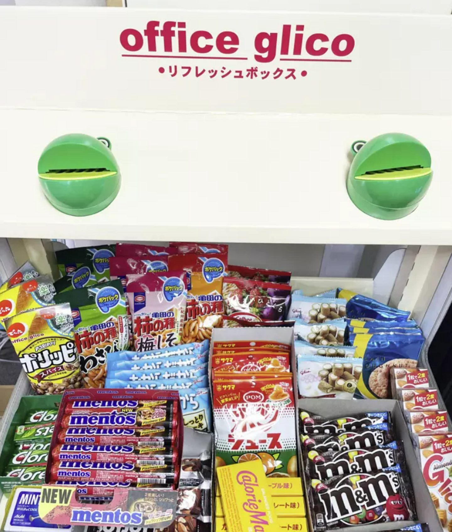 マクロジでは、食の福利厚生で「オフィスグリコ」の専用のボックスがあり、お菓子を購入できるようになっていました。