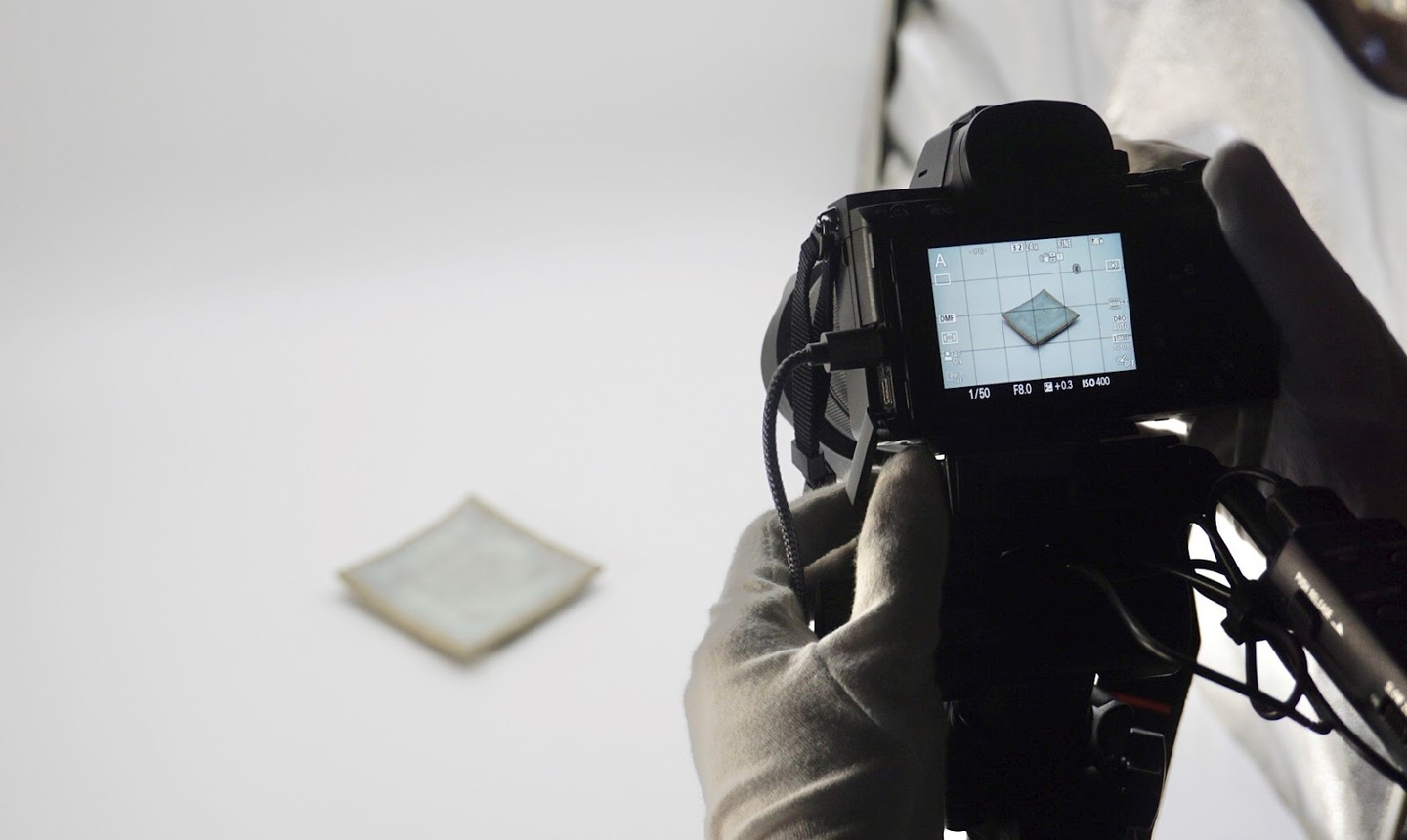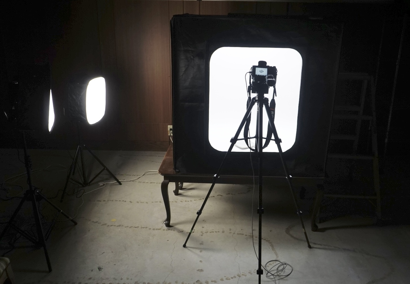 影を作らず均一な明るさで写るように、ボックスに入れて撮影します。