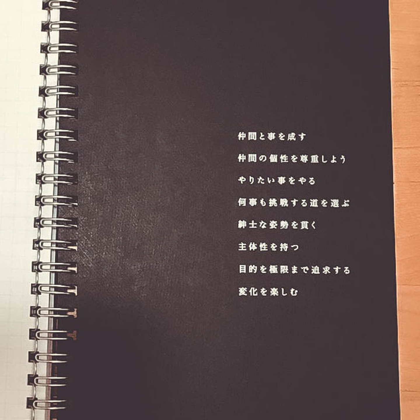 上記で伝えたように、自社のノートとしてメンバーが積極的に使ってくれるようになったおかげでメンバーから「新しいノートが楽しみです」「次はどんなデザインですか?」などの声が上がってくるようになりました。と同時に、弊社の企業理念も完成したため、普段メンバーが使用するものに入れておきたい想いがあります。また、日々の仕事で何か迷ったとき、困難にぶつかったときに拠り所としてノートを開けば見れるようにという数々の想いから、ノートに企業理念を記載しました。