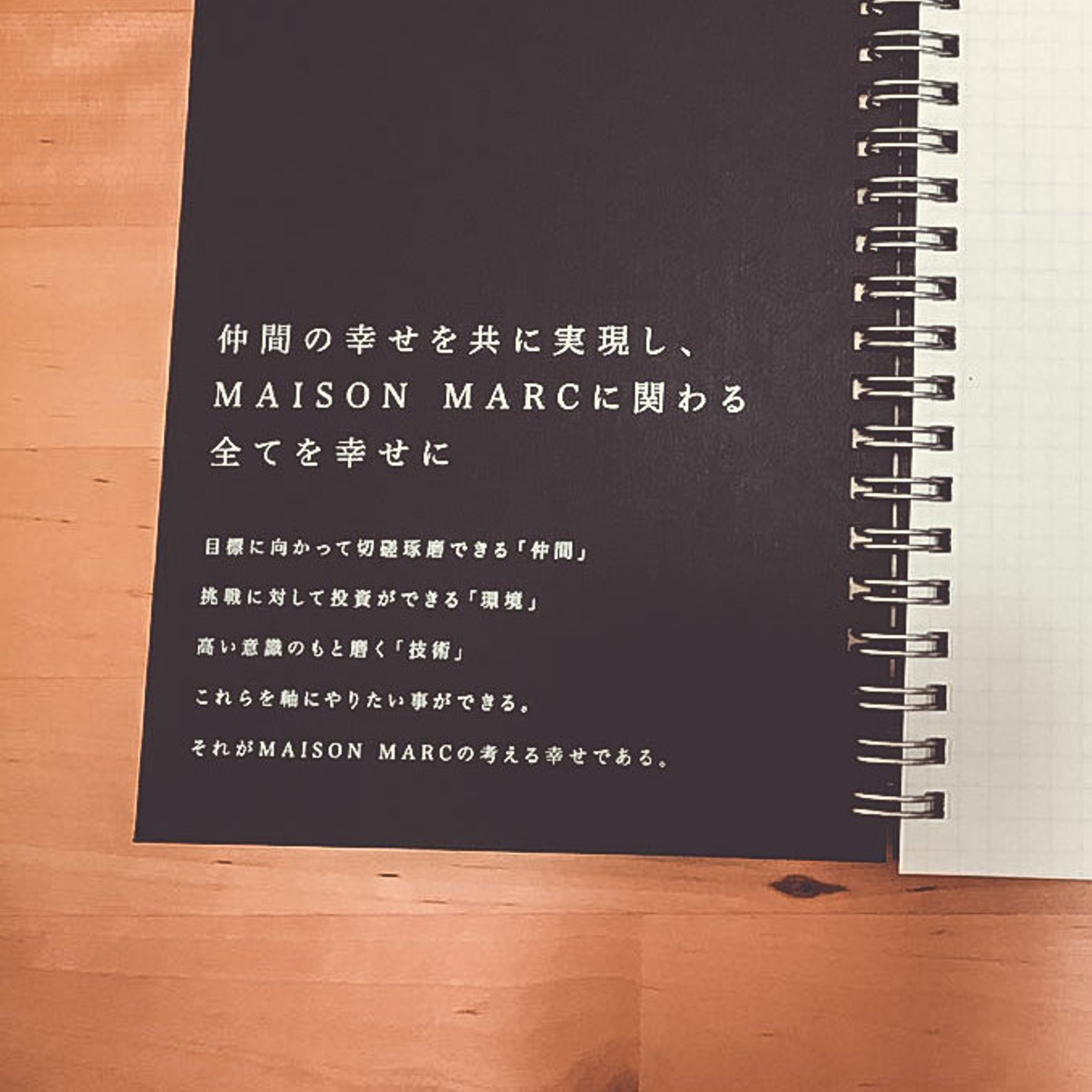 最初は予算も少なくクオリティが低かった中、それでもデザインがかっこいいからとメンバーが打ち合わせに行ったりプライベートでも利用して「かっこいい」と褒められるのは製作者冥利につきます。褒められたメンバーも嬉しそうに話をしてくれるのは、本当に幸せなことです。 ノートを作り続けることは、弊社の企業理念である「仲間の幸せを共に実現し、MAISON MARCに関わる全てを幸せに」にもあるように、メンバーが喜んで使ってくれるものを作り、その喜びを周りにも分け与えてくれる環境を作っていけると信じています。
