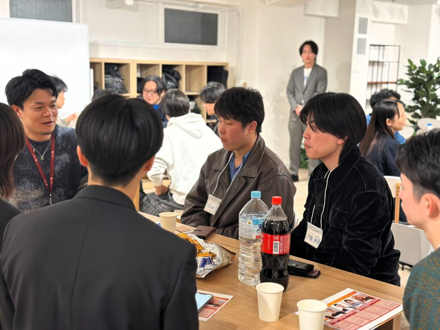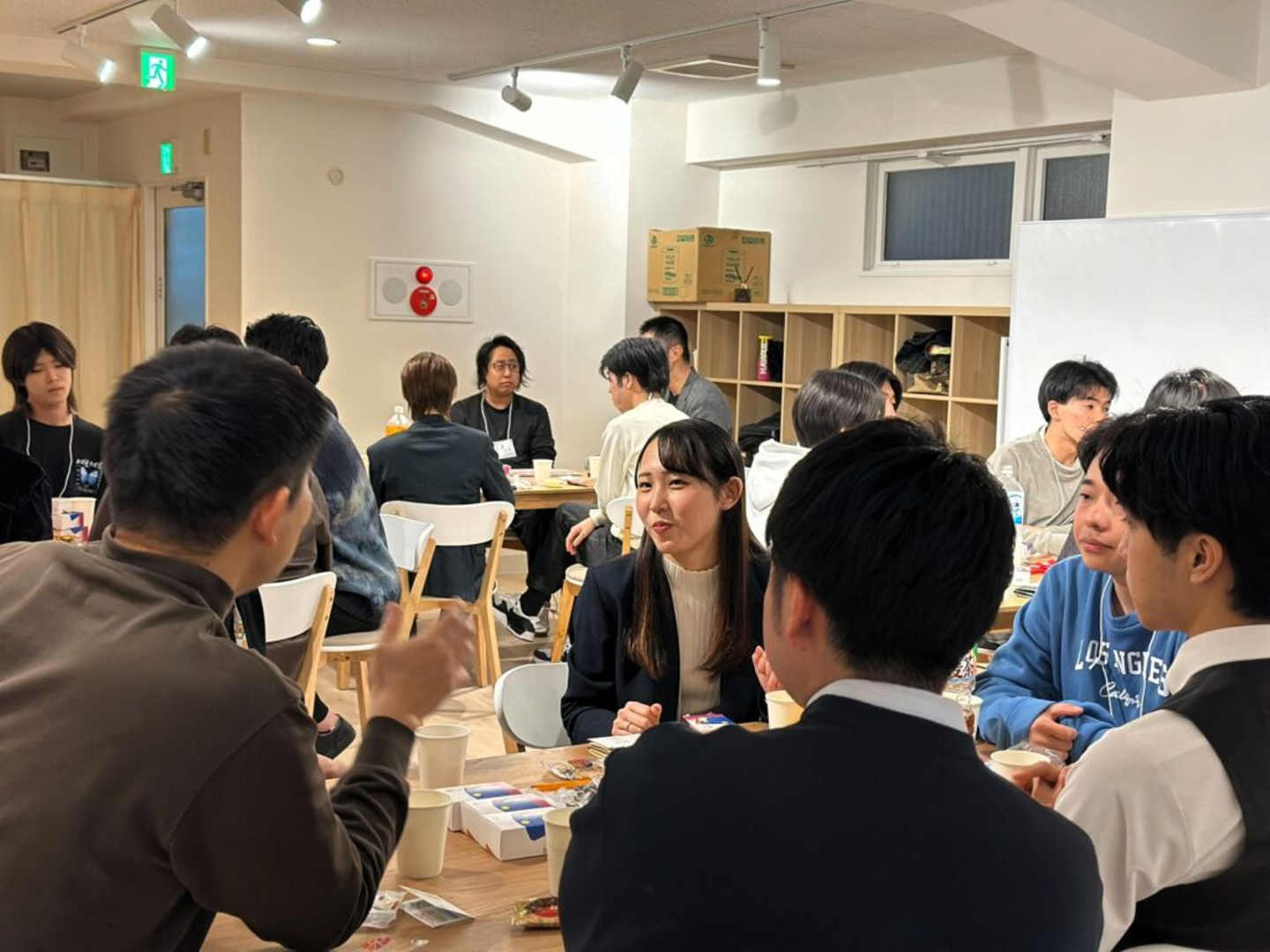 後半の座談会では、お菓子やジュースを片手に、各テーブルで非常に密度の高い対話が行われました 。関東の学生らしい積極性で、経営者が場を回すのではなく、学生側が主体となって質問や議論をリードする姿が印象的です!!すでに事業を立ち上げている学生もおり、資金調達の悩みなど「ビジネスミーティング」さながらの熱を帯びた時間となりました !!