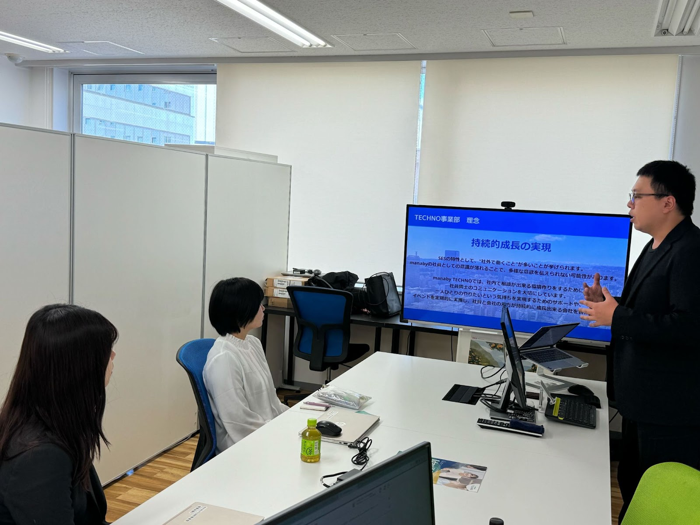 午前中は、まずmanabyの説明や事業理解から始まりました。manabyがこれまでにどのような取り組みをしてきたか、またSES事業の仕組みについて詳しく解説。その後、学生さんたちからはエンジニアの働き方や困難な部分、やりがいなどについての質問があり、私自身のエンジニア経験からお話しました。最初は緊張していた学生さんも、徐々にリラックスし、発言しやすい雰囲気になっていきました。