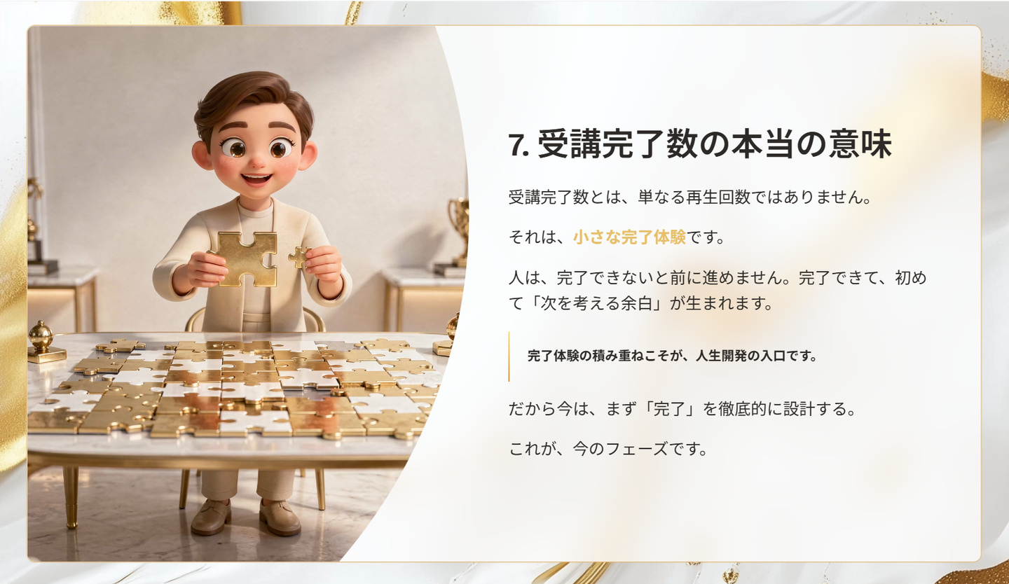 受講完了数は、単なる再生回数ではなくて、「やり切った」という小さな成功体験の積み重ねなんです。