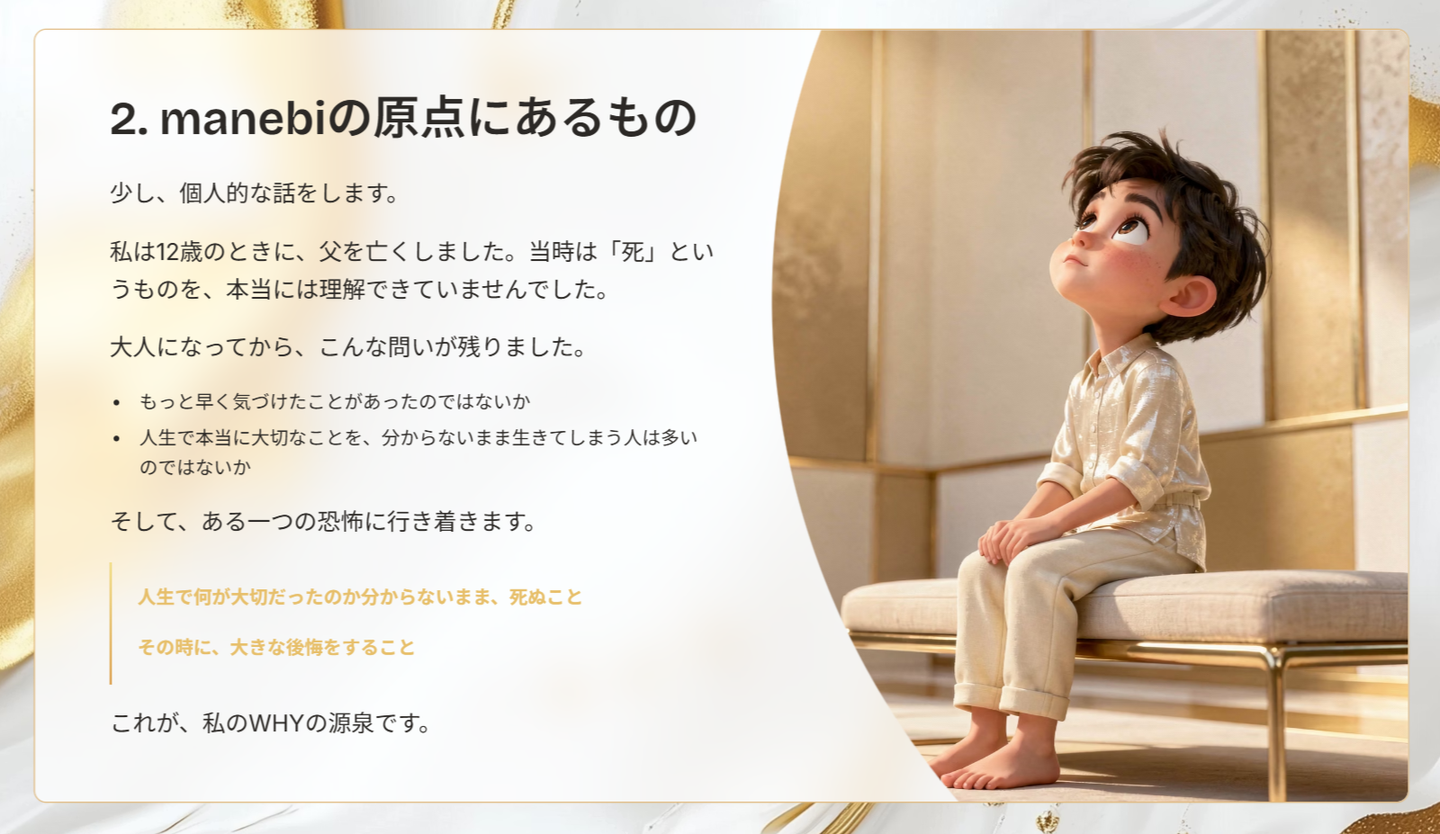 manebiが「何を大切にし、どこへ向かおうとしているのか」その根底にあるものを共有させて頂きます。