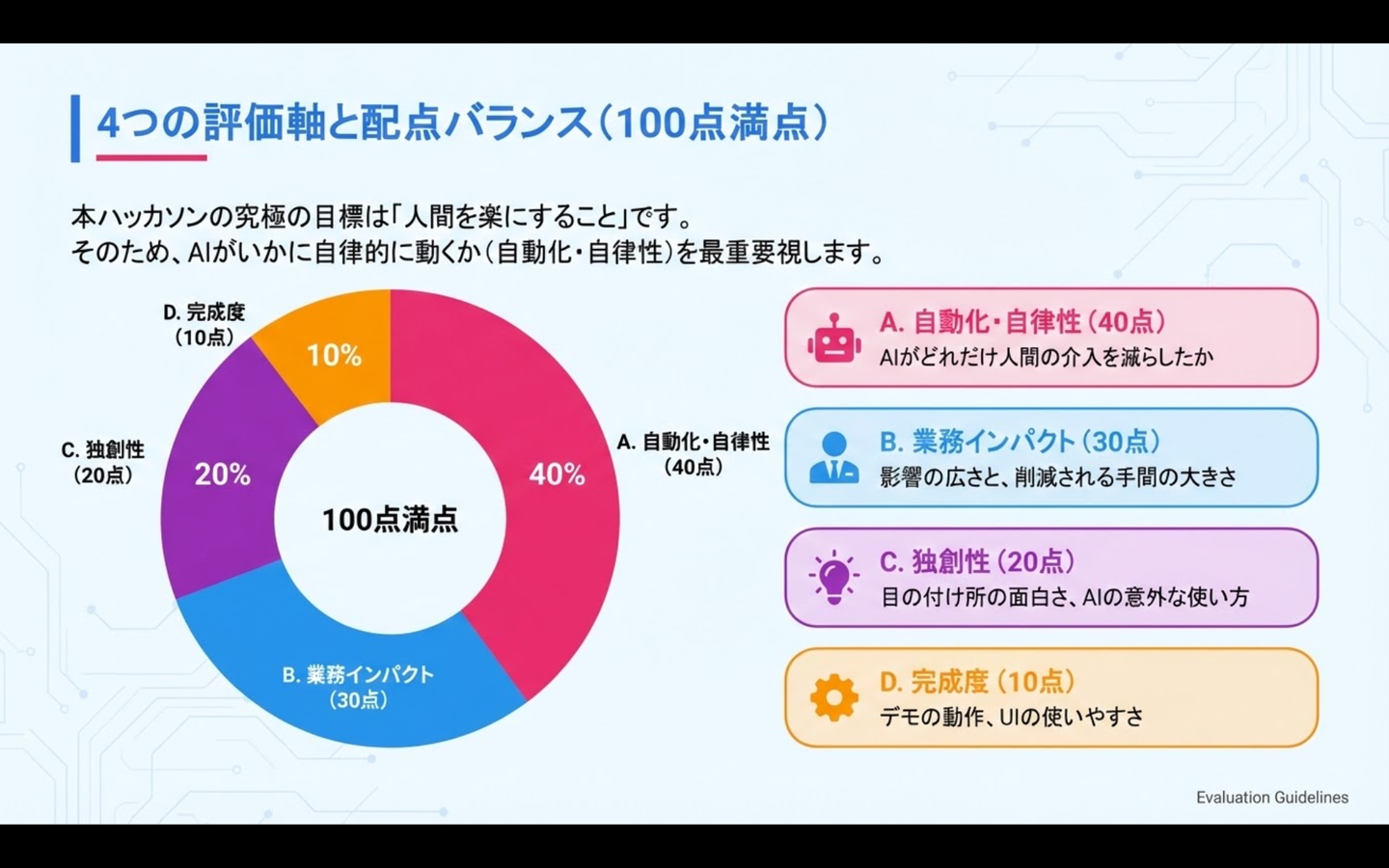 今回のAIハッカソンでは、評価の軸にもこだわりました!