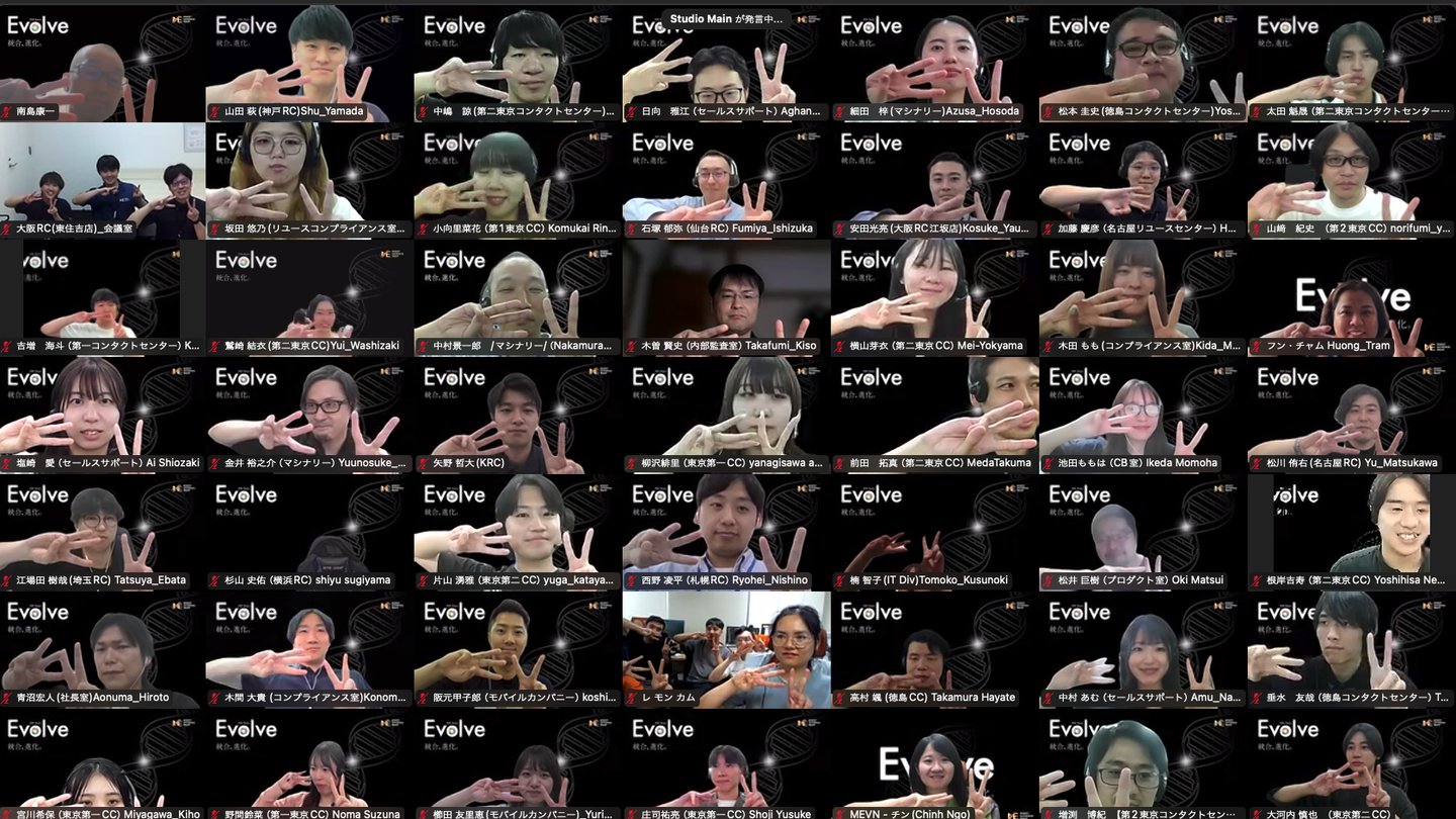 例年通りキックオフミーティングはオンラインで実施されましたが、全社員リアルタイムで参加。オフィスのデスクで参加するメンバーもいたり、部署によっては会議室に集まり、みんなで一つの画面を見ながら参加したりと、それぞれスタイルは自由です。