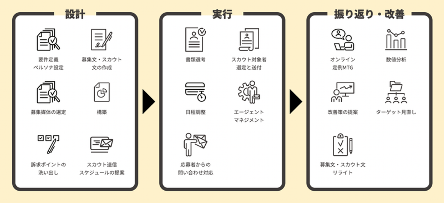 採用代行・RPOといっても、新卒の応募者のコールセンター代行も採用代行などもあり、各社の業務範囲はバラバラです。僕らはまるごと人事というサービス名の通りまるごとやっていて、採用コンサルティングに近い「採用設計」と「振り返り・改善」といった課題解決の提案までが業務範囲です。ここまで踏み込んだRPO企業だからこそ、専門性が高い採用スキルが身につきます。