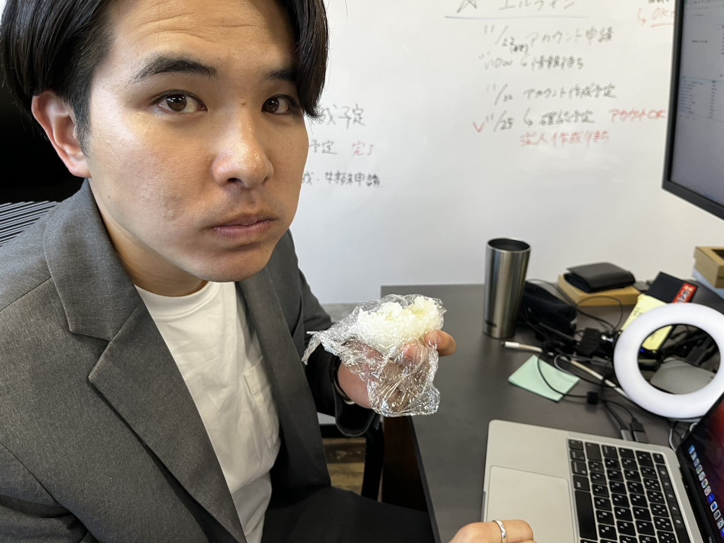 15:00頃に会社の電子レンジが「チーン」と鳴ったら温仁くんがおにぎりを食べる合図。