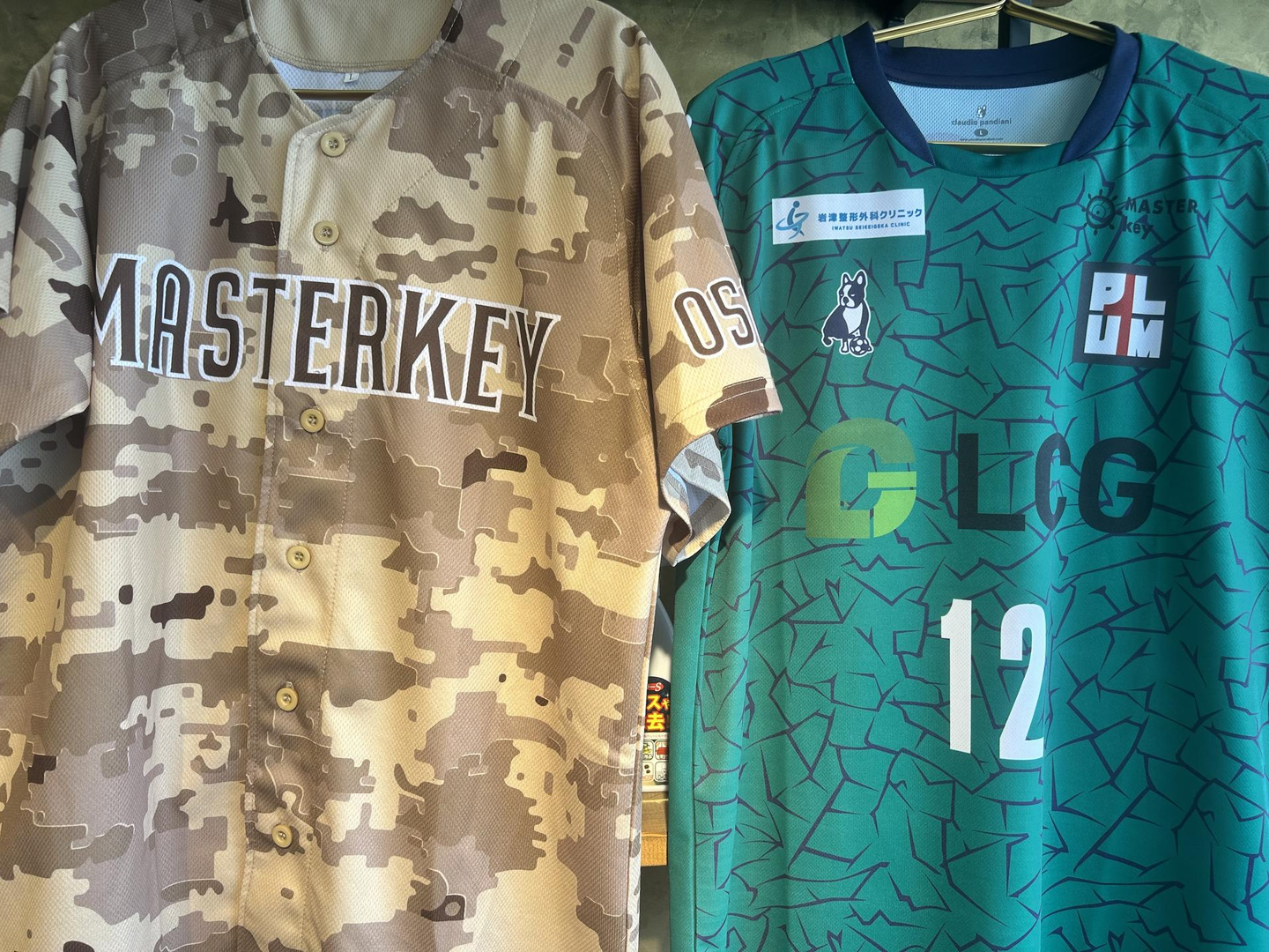 (左が弊社野球部のユニフォームで、右がプラムワンのユニフォームです。)