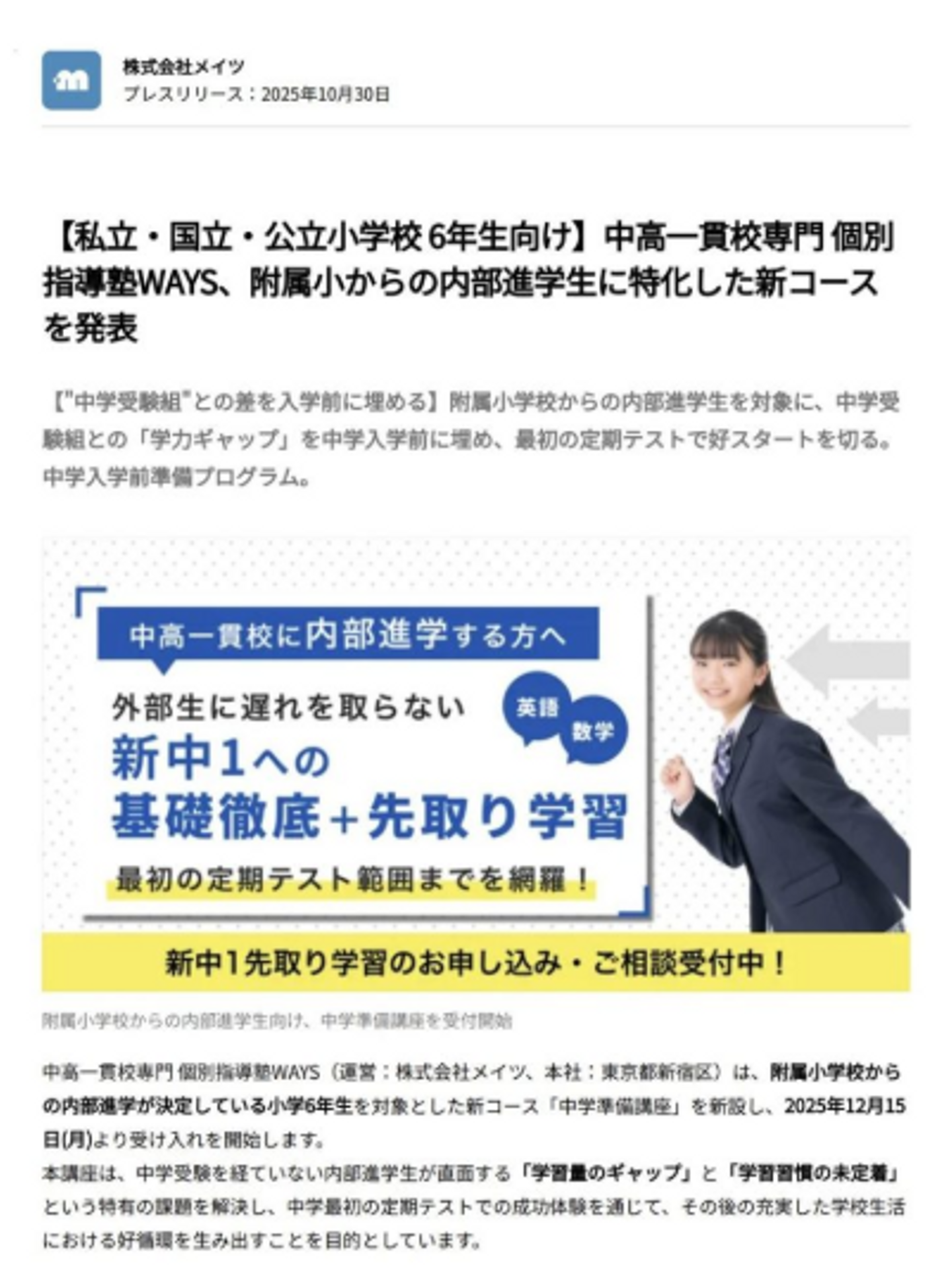 中高一貫校専門 個別指導塾WAYS(運営:株式会社メイツ、本社:東京都新宿区)は、附属小学校からの内部進学が決定している小学6年生を対象とした新コース「中学準備講座」を新設し、2025年12月15日(月)より受け入れを開始します🌈