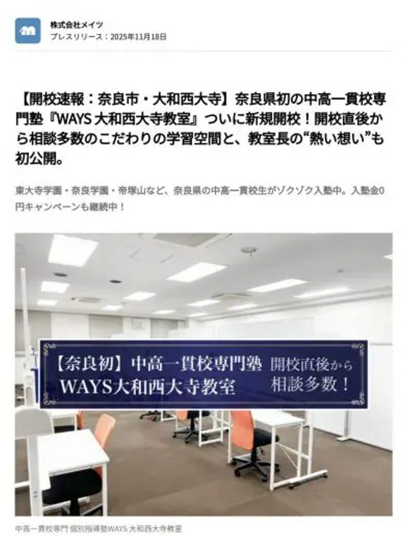 中高一貫校専門 個別指導塾WAYS(運営:株式会社メイツ)は、2025年10月20日(月)に奈良県初となる『WAYS大和西大寺教室』を正式開校いたしました🎉