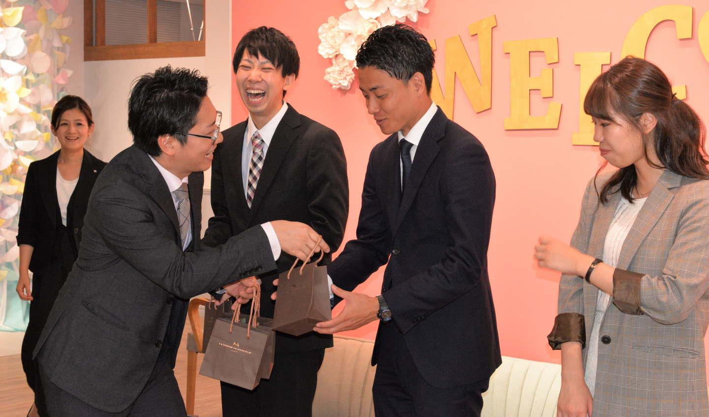 最後は、ゲストが帰る際にプチギフトを手渡しする結婚式スタイルを真似て、内定者へ「お家に帰ってから食べてくださいね」と、プチギフトをお渡し!