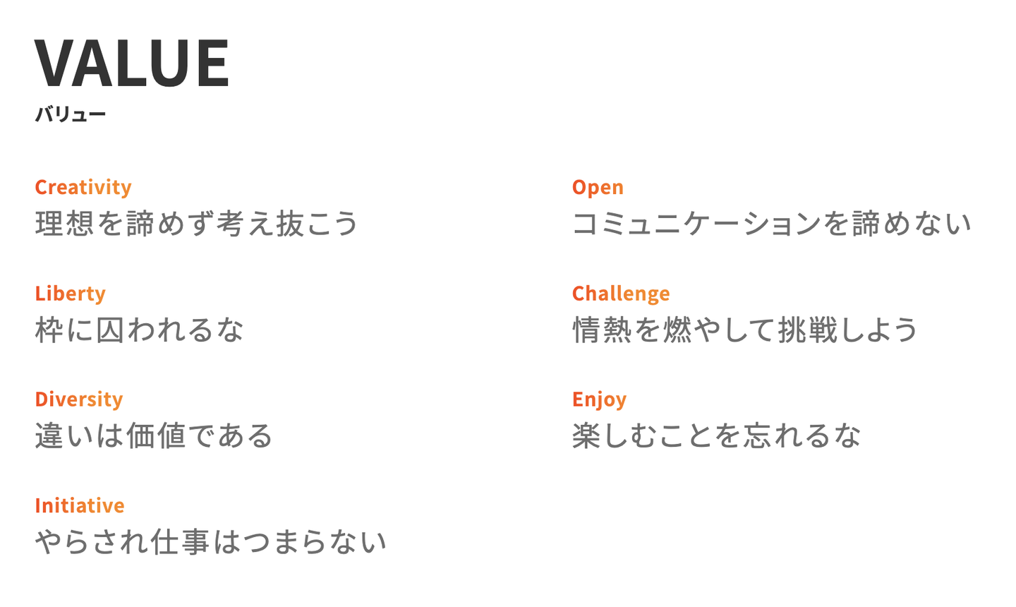 基本的に自由な会社ですが、共通の価値観や行動指針としてのバリューをとても大事にしています。