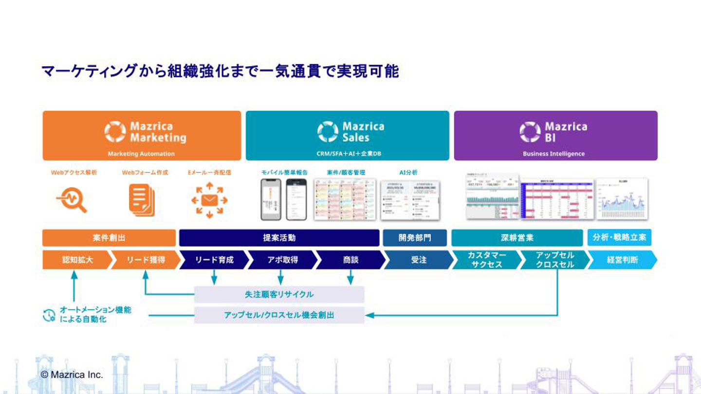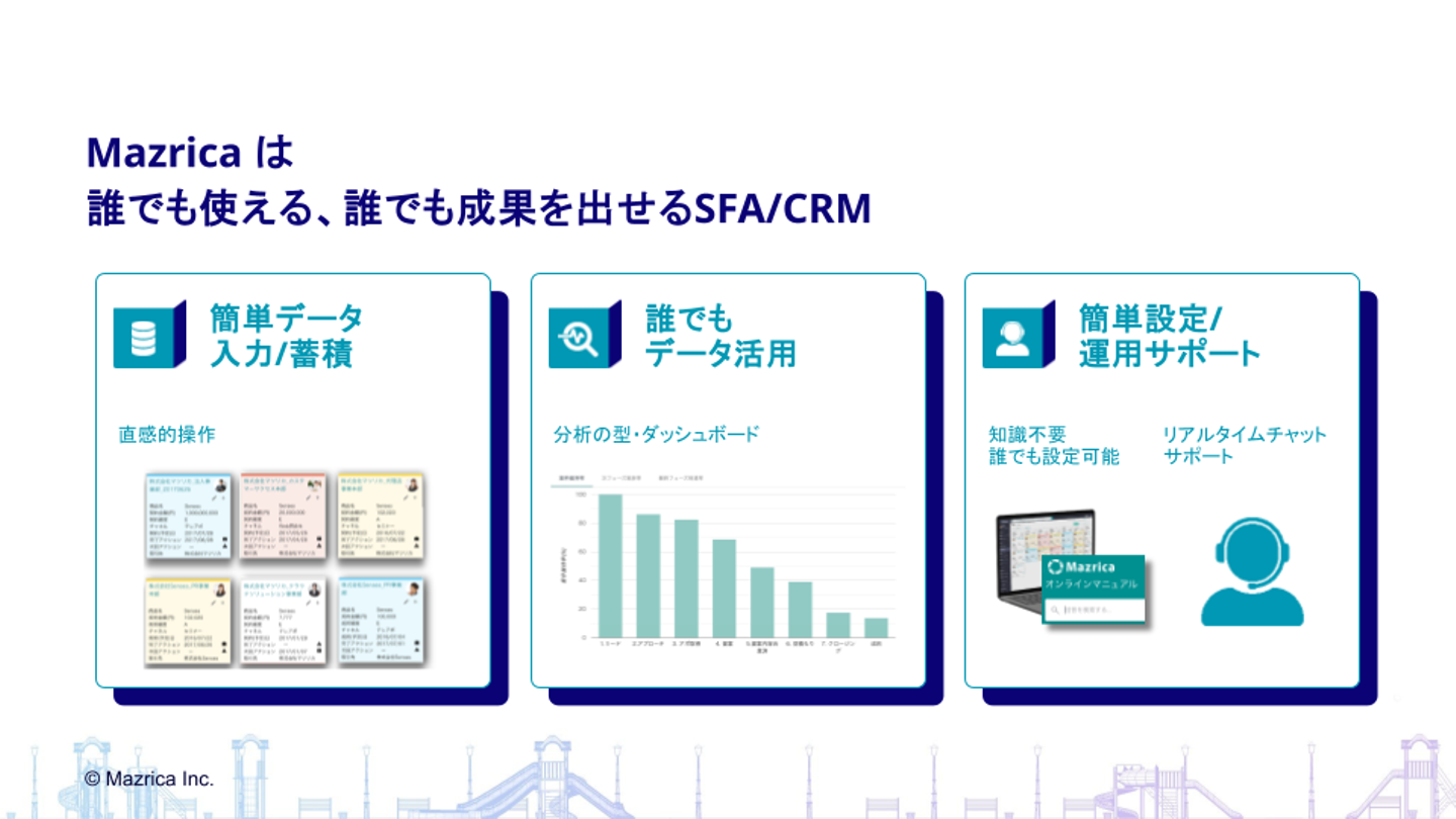 そこで、現場の営業パーソンにとっても、自分たちの営業活動をより豊かにするために、より楽しく、やりがいを持って使えるSFA/CRM、というところにフォーカスしているのが、弊社のプロダクト「Mazrica 」です。