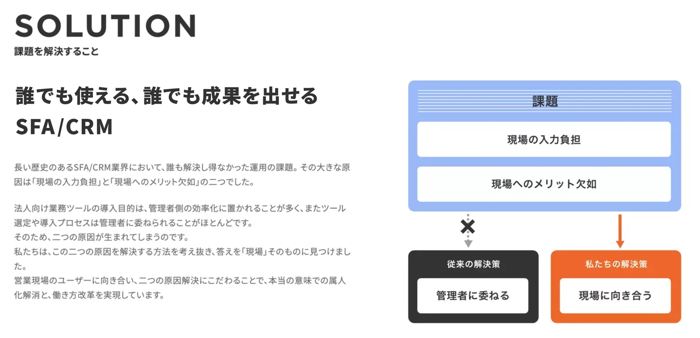 この業界には長年解決されていない課題があって、「管理」という言葉が示唆するように、従来のSFA/CRMは基本的には管理者に価値が届くツールなので、少し極端な言い方をすると、実は現場を無視したツールになってしまっていたんです。
