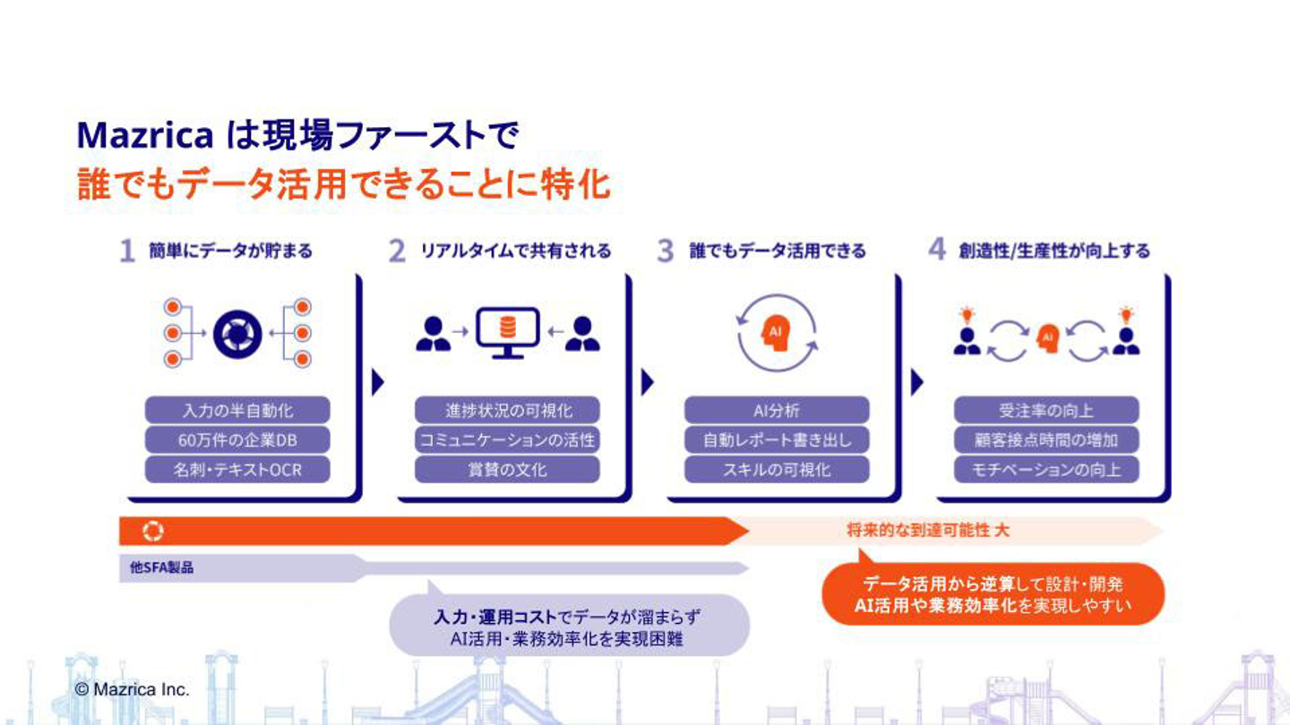 他社製品は「使いにくさ」や「運用しづらさ」がボトルネックとなり、データが貯まらず、ユーザー企業は「データを活用する」段階まで辿り着くことが難しいのに対し、Mazricaは当初から「データの活用」のために「現場のユーザー」に使いやすいプロダクトを目指してきました。