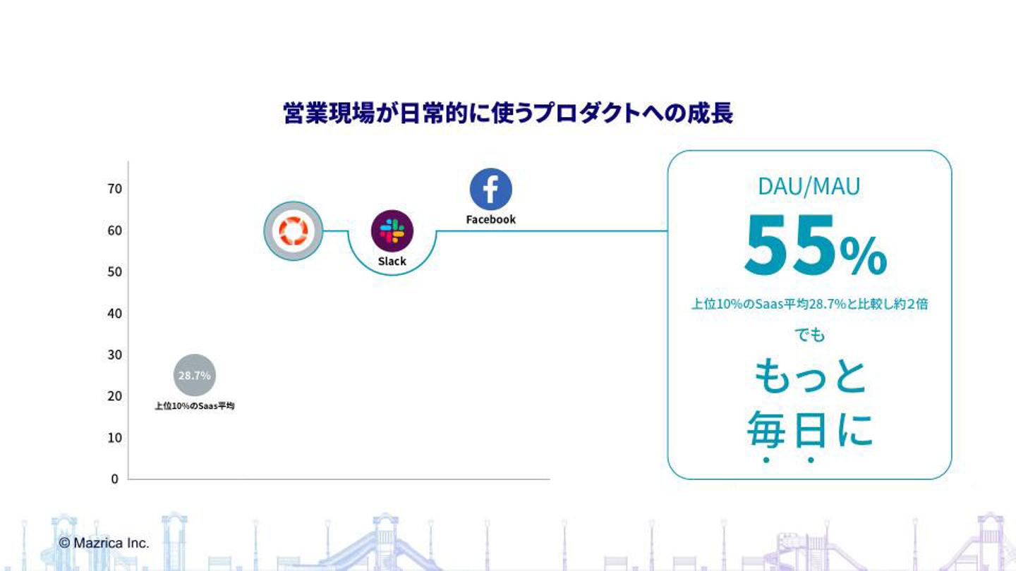 例えば、Mazricaのアクティブ率は55%を記録しているのですが、これは上位10%のSaaSの平均アクティブ率が28.7%の中、毎日使っているユーザーが60%を占めるチームコミュニケーションツールレベルの驚異的な高さとなっています。
