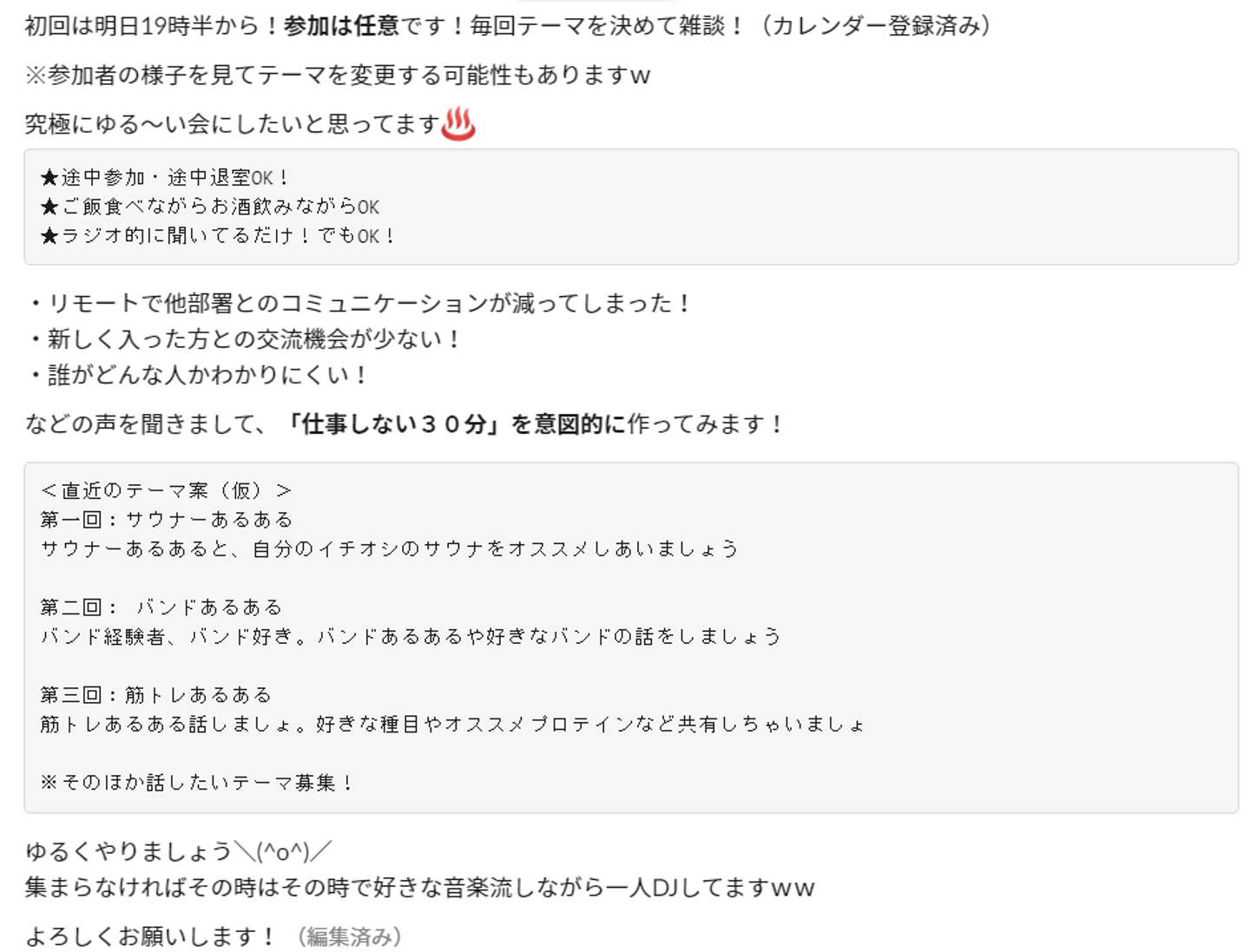 その一環として今月から始めたのが「夜の雑談会」という激ゆる雑談イベント!