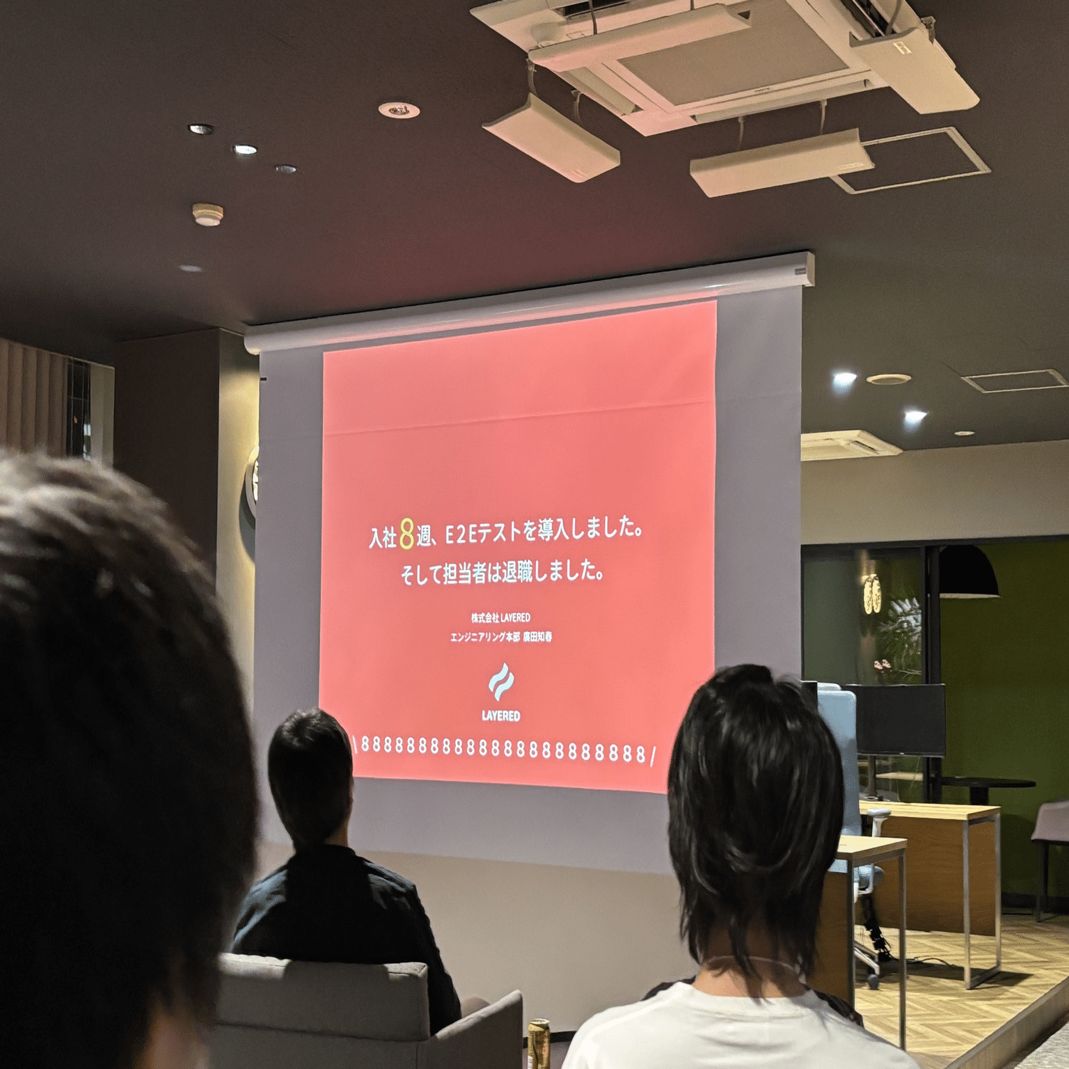 弊社から廣田さんが登場です。入社8週目の苦労を話してくれました。E2Eテストを急に無茶ぶりで任された話で、技術的な話題を盛り込みながらもレイヤードの開発の雰囲気が垣間見えるいい発表でした!廣田さんお疲れ!