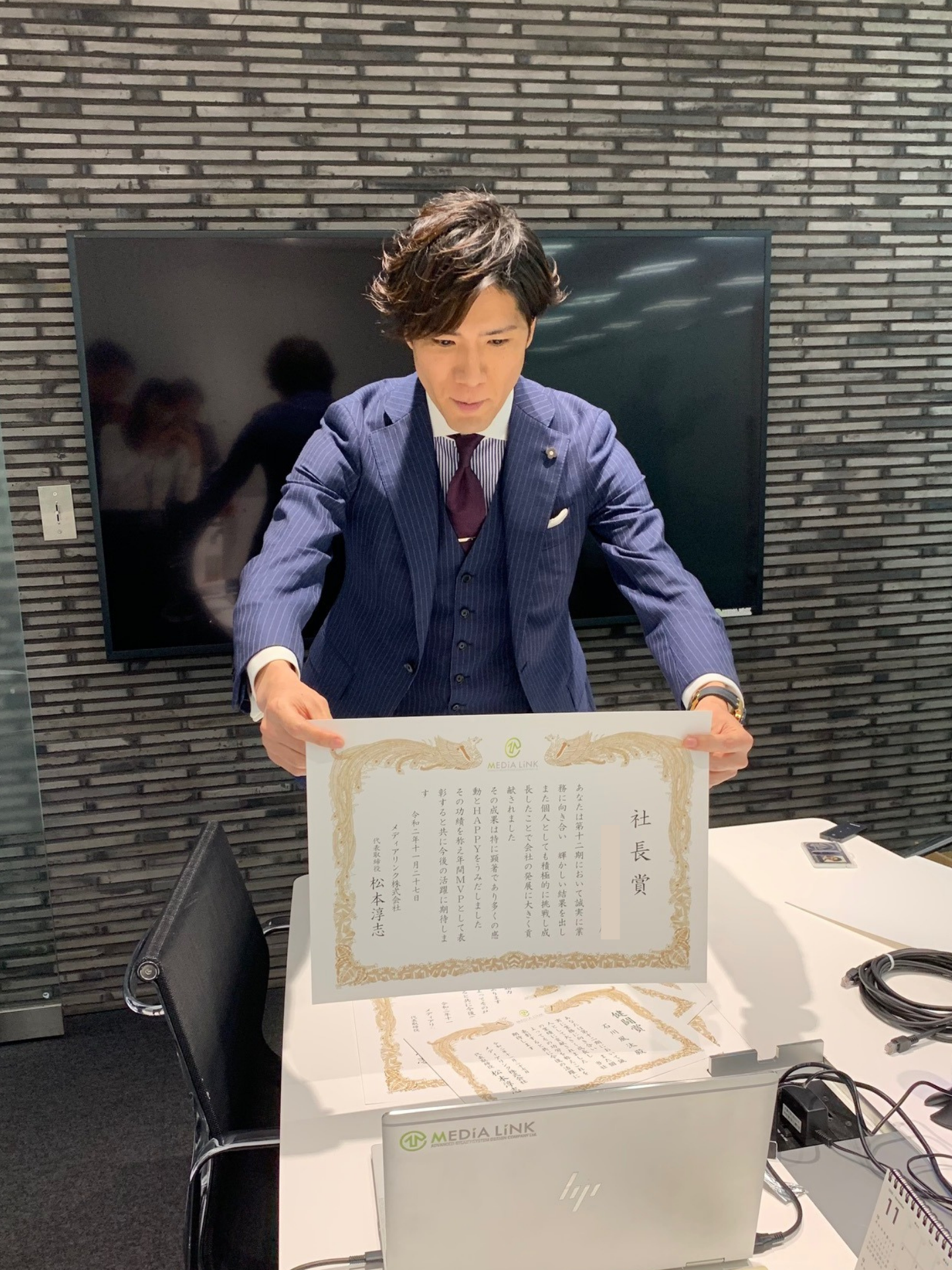 私はバックオフィス部門で労務も担当しているため、毎年表彰前に受賞者がわかってしまうのですが、今回は完全サプライズ!代表と私の部下が、私にばれないように徹底して準備をしてくれていました(感動)!受賞&サプライスで準備してくれたたことがダブルで最高にうれしかったです!(写真左:私、右:代表)