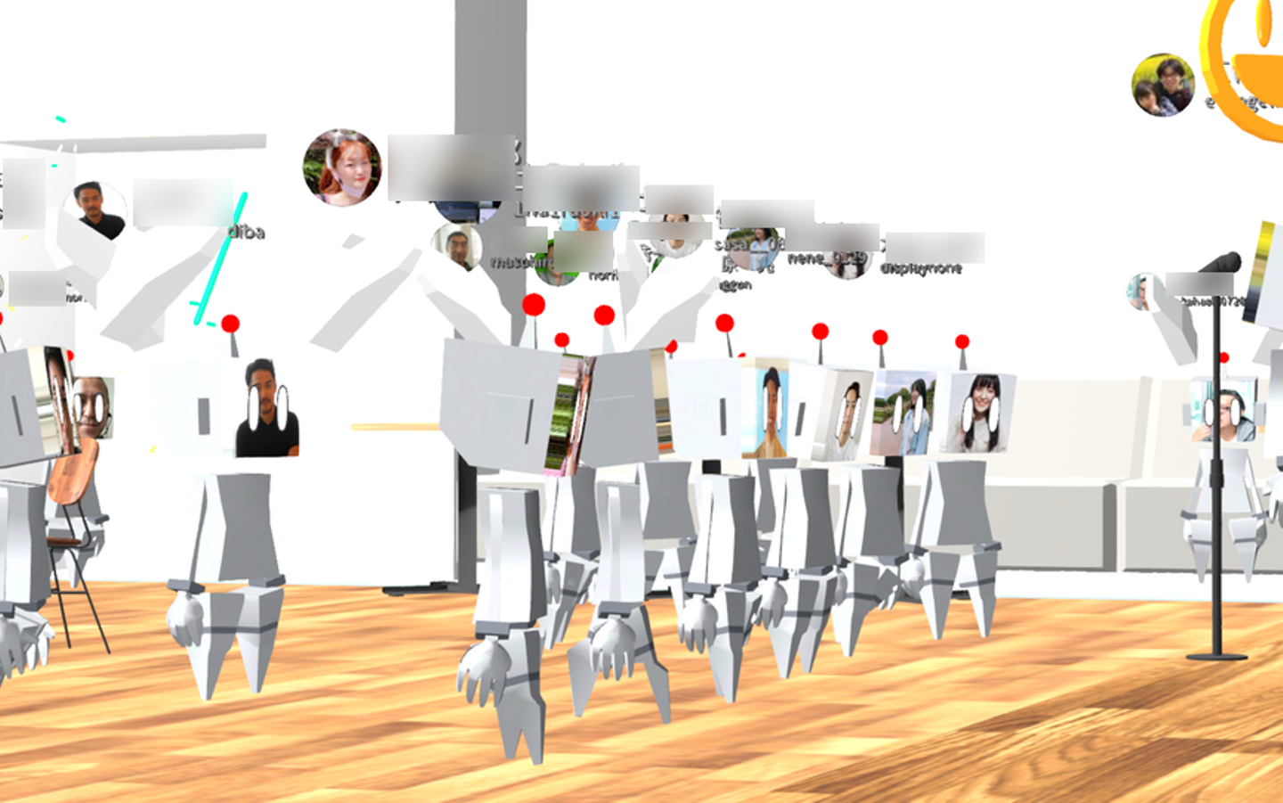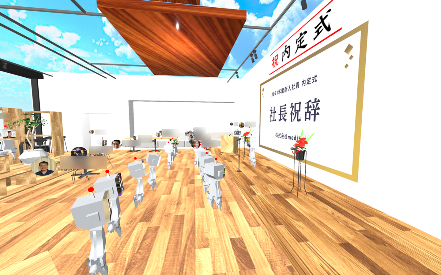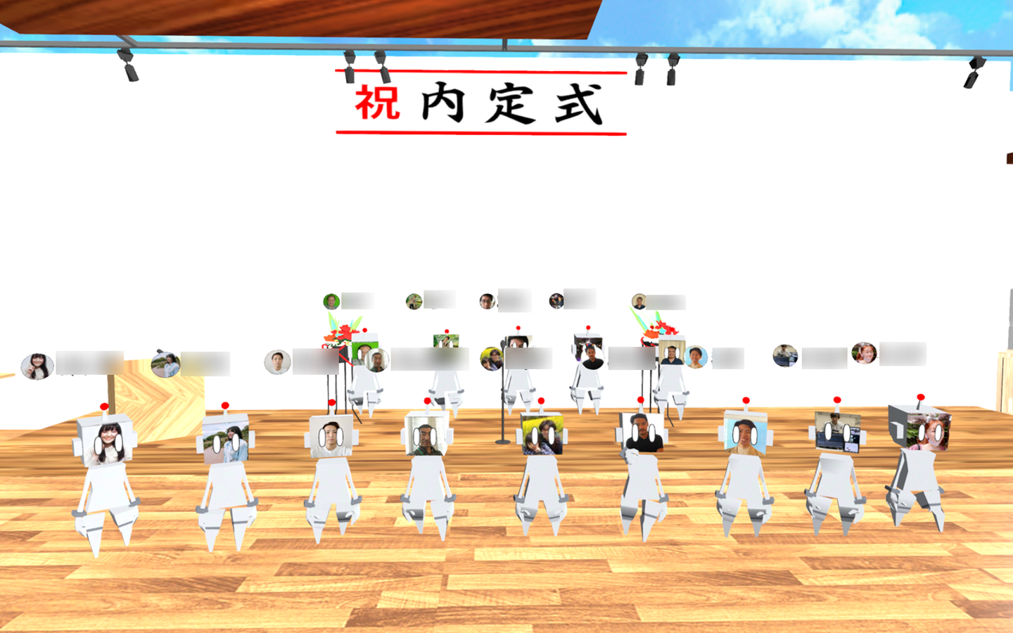 開始時間が近づくと、「アバター」たちが続々と入室してきます。アバターには内定者や社員たちの顔写真がはめ込んであります。さらに、アバターでアクションできることもあって、単なるビデオチャットよりも集まって話しているような感覚に。入室からしばらくのあいだで内定者も気分が高まったようです。